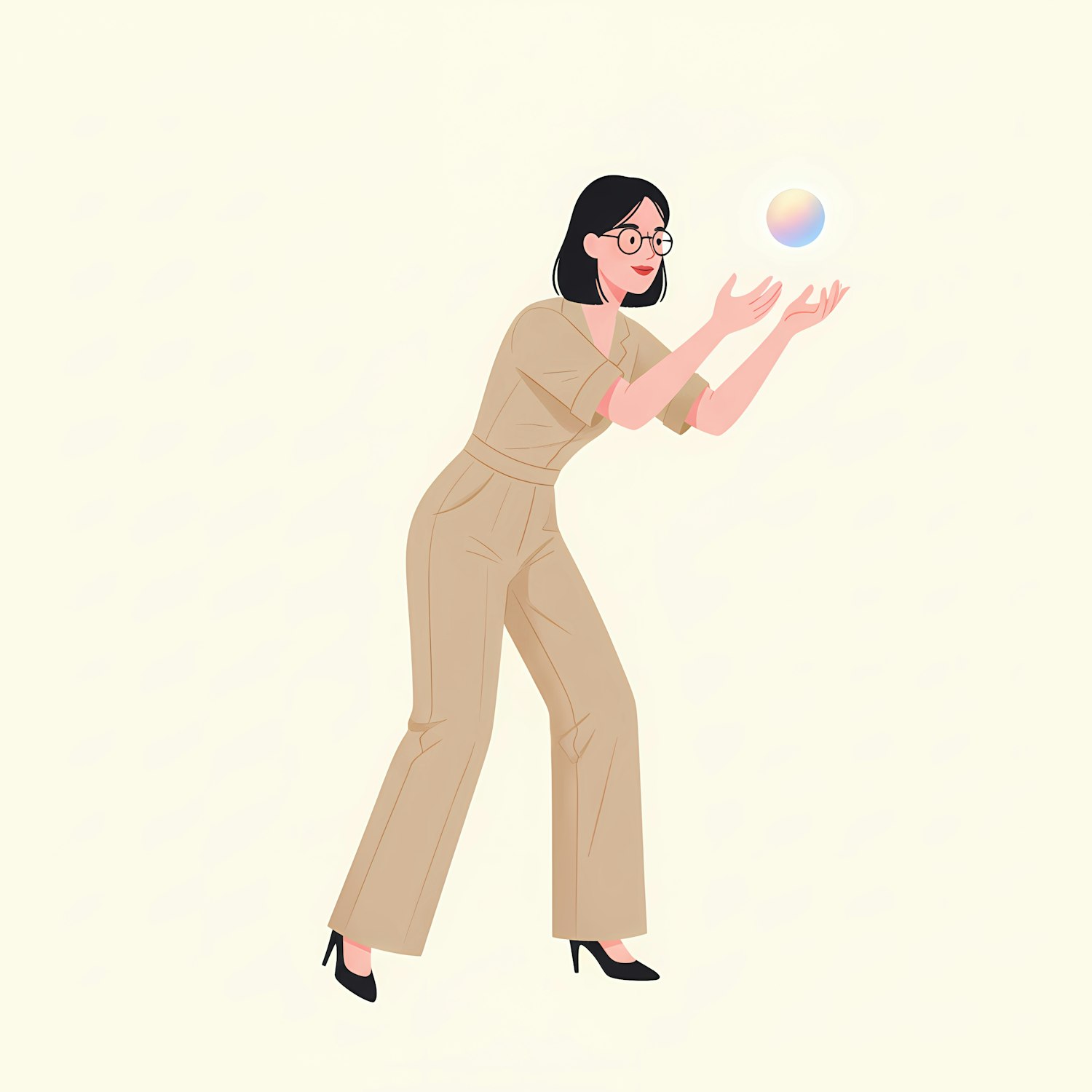 Illustration of a woman in a beige jumpsuit interacting with a glowing orb, set against a light cream background.