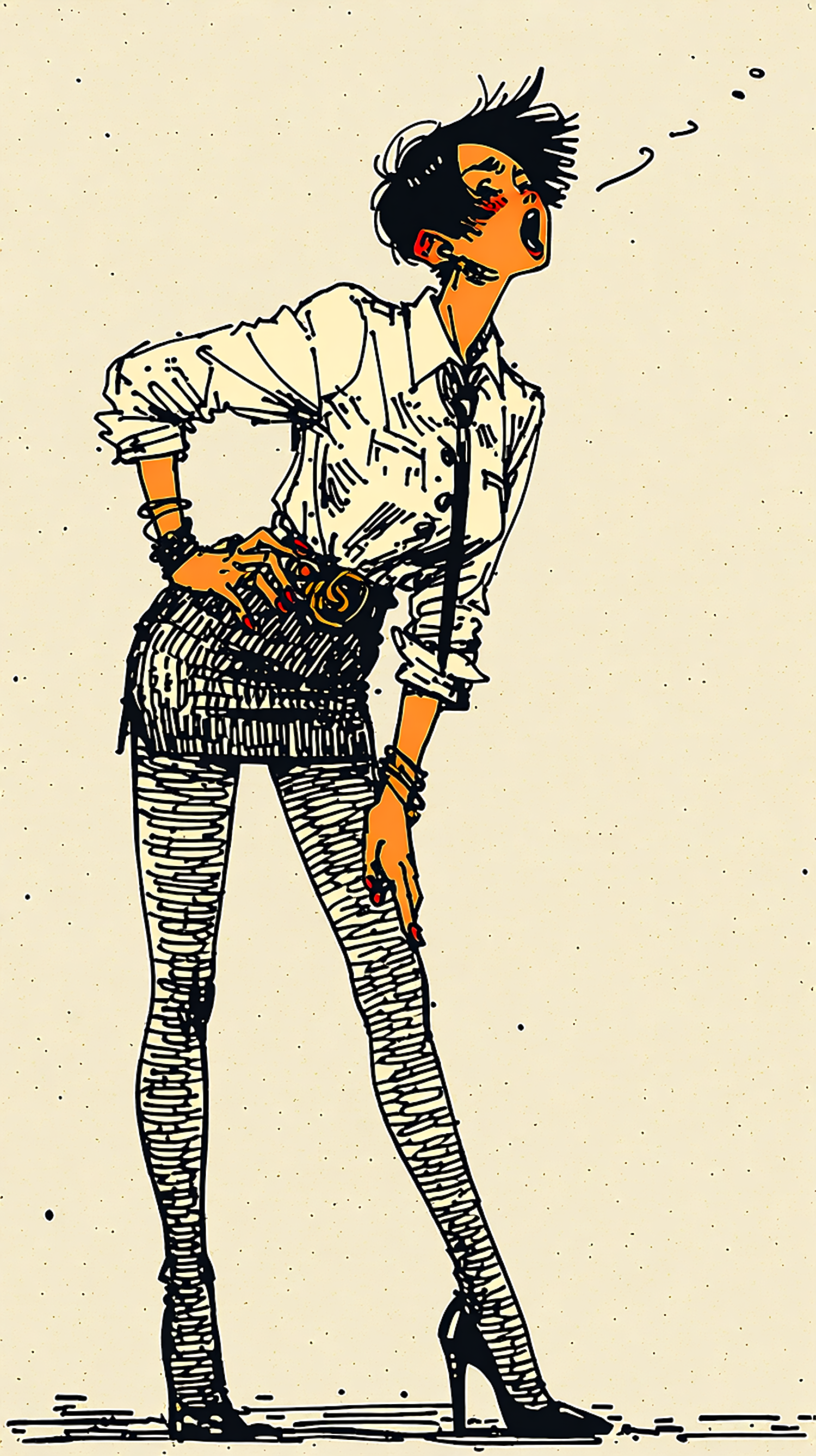 Stylized illustration of a person in a dynamic pose, wearing a white shirt, short skirt, patterned tights, and high heels on a beige background.