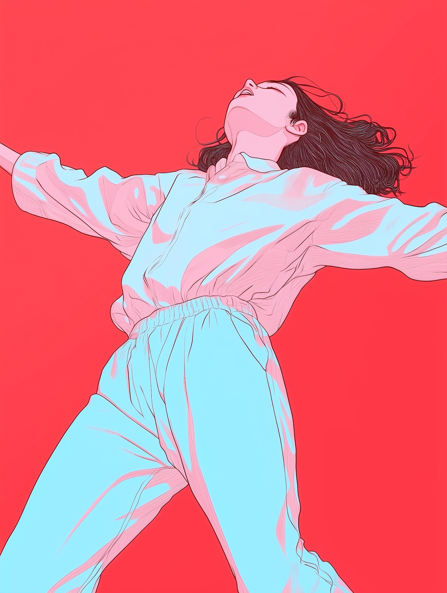 Dynamic illustration of a person in white clothing against a vibrant red background, expressing freedom and joy with outstretched arms.
