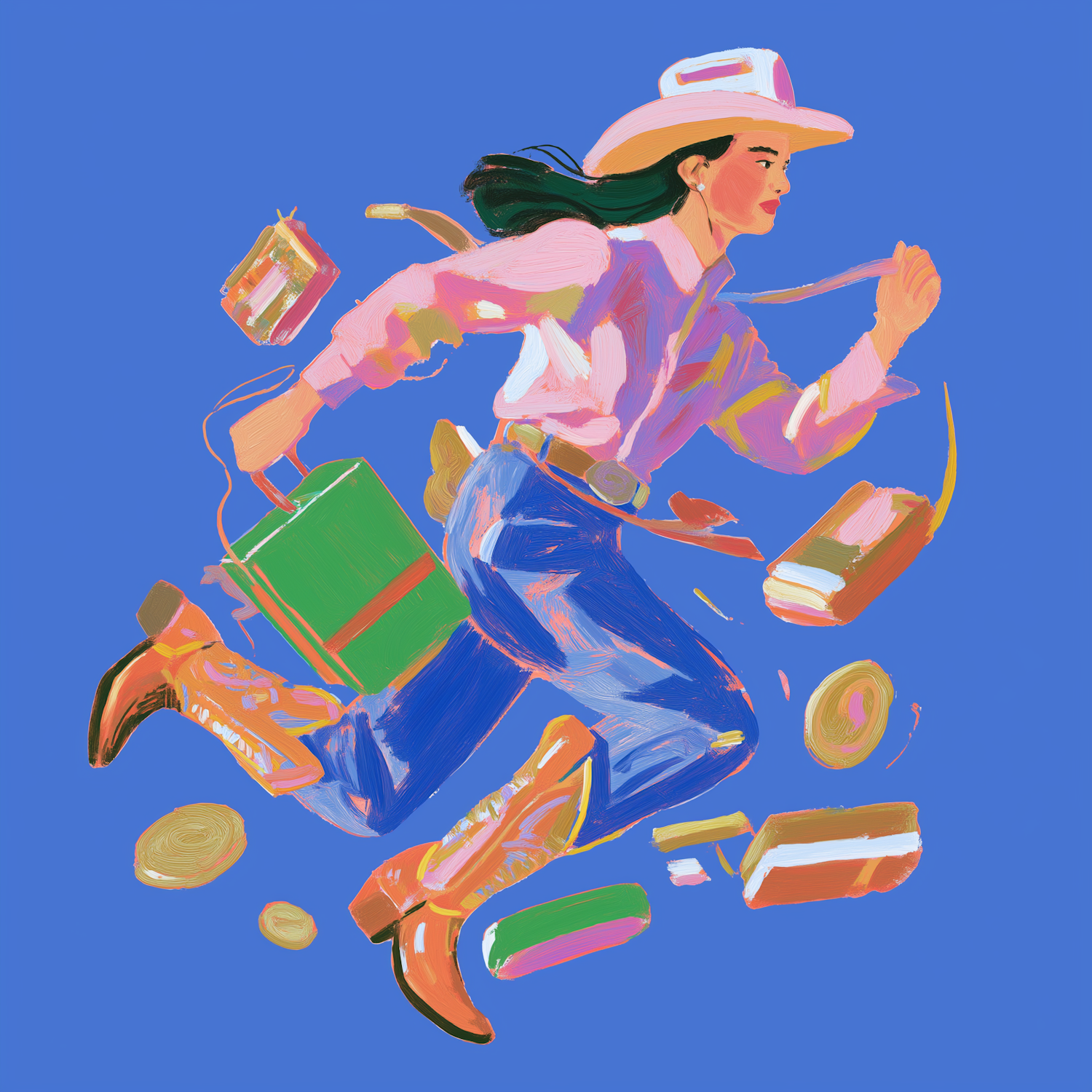 Dynamic illustration of a person running with a green bag and scattered books, wearing a cowboy hat and boots, set against a blue background.