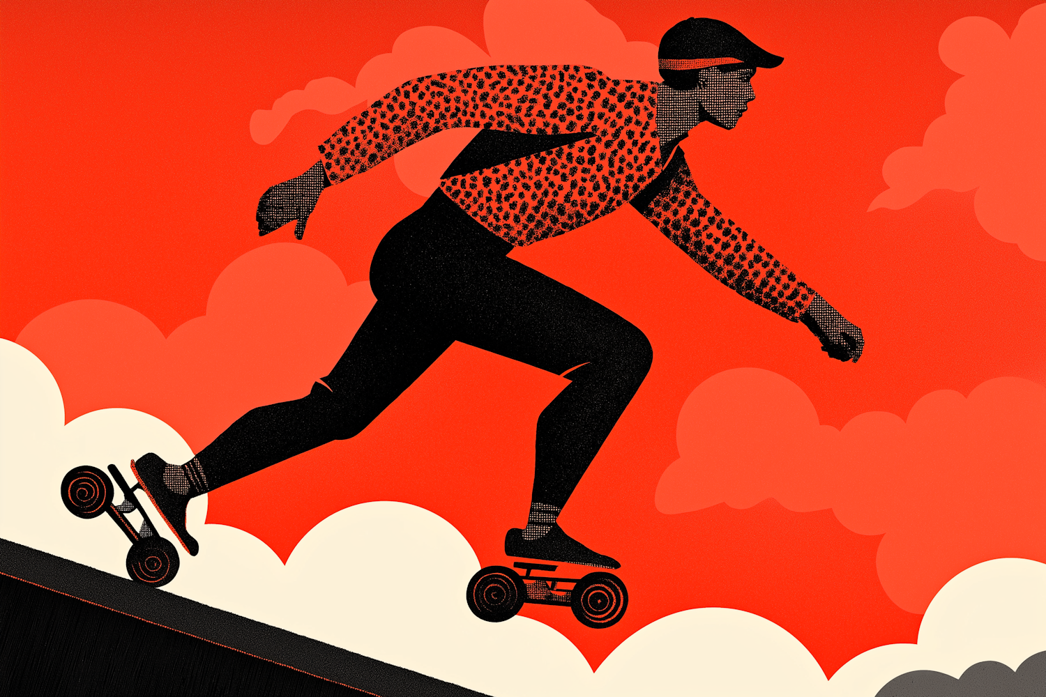 Dynamic illustration of a person skateboarding downhill against a vibrant red background with stylized clouds.