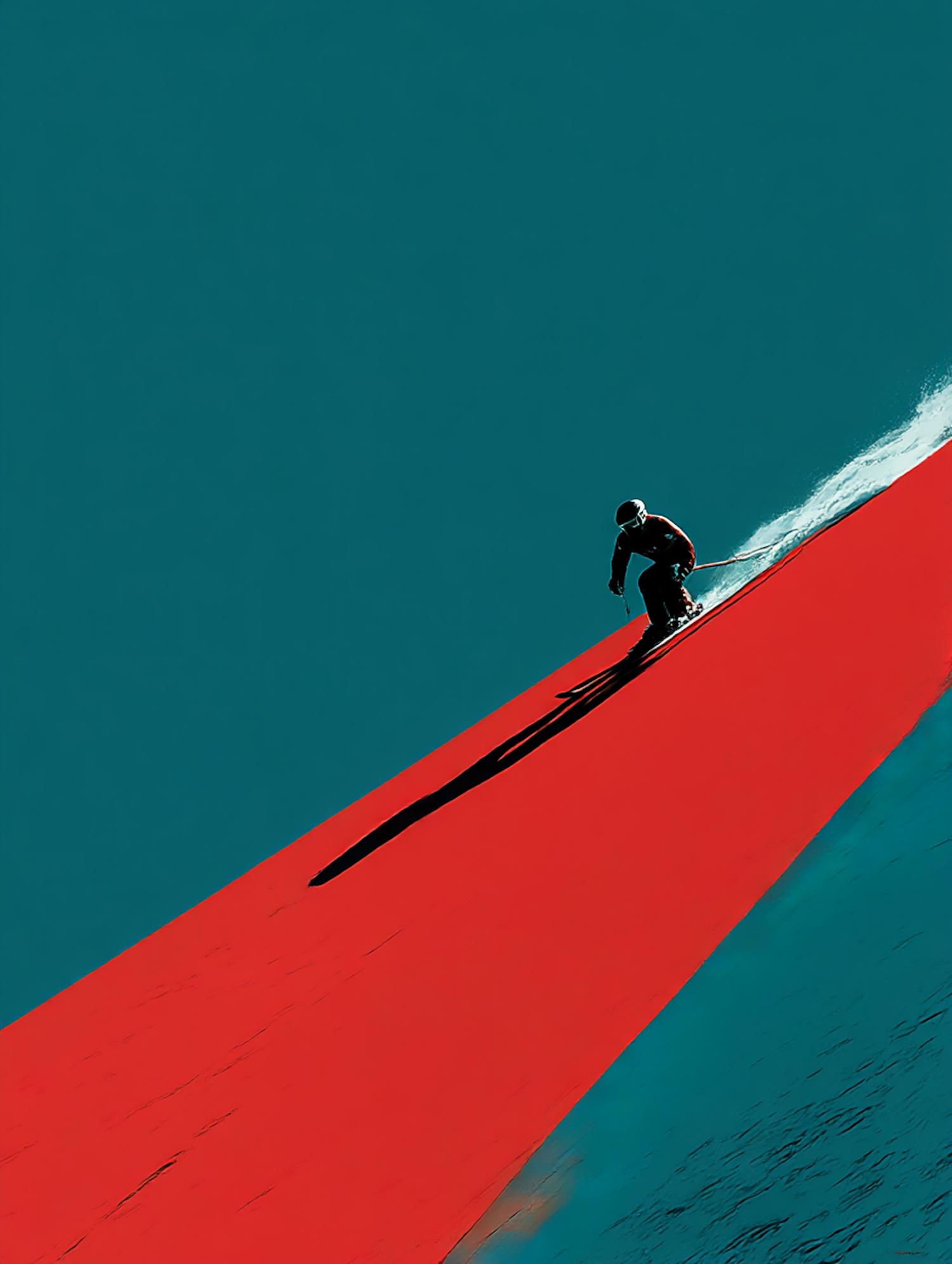 A skier descends a vibrant red slope against a teal background, creating a striking and dynamic visual with bold contrasts and motion.
