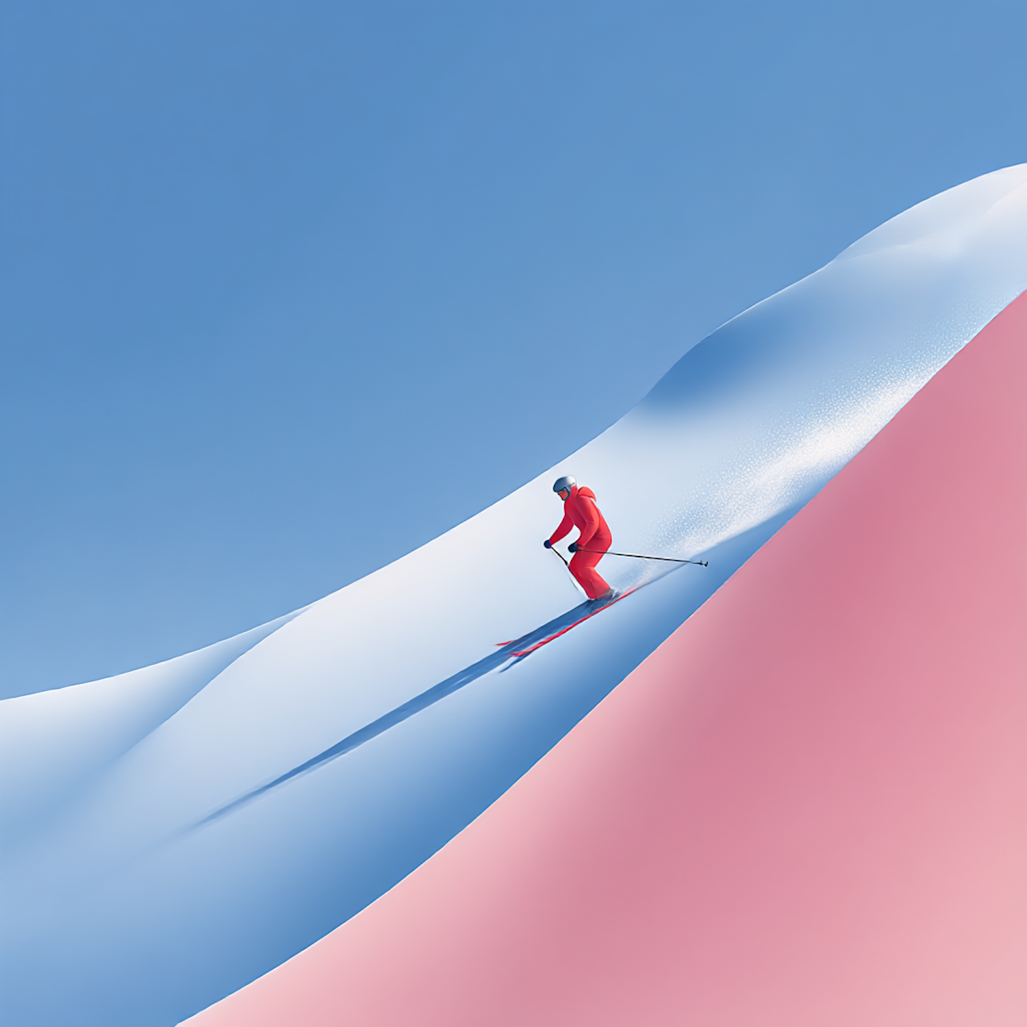 A skier in a red suit glides down a snowy slope under a clear blue sky, creating a dynamic and visually striking scene.
