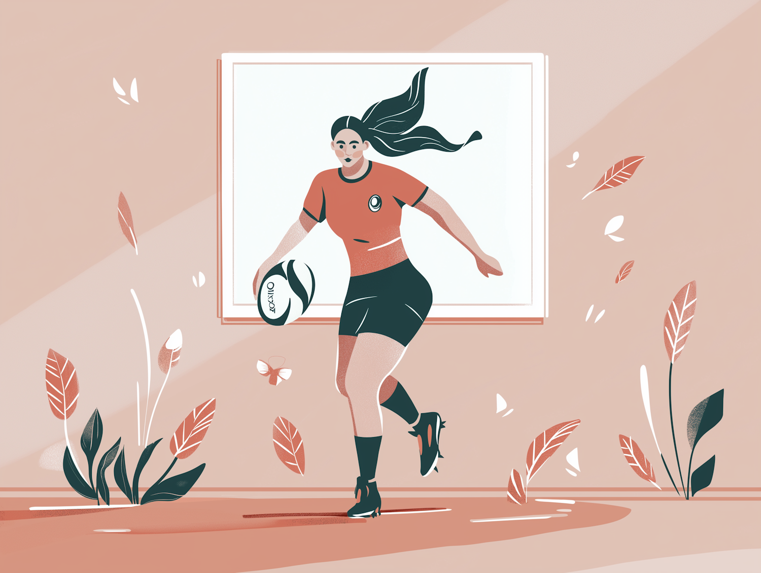 Dynamic illustration of a female rugby player running with a ball, set against a warm, abstract background with leaves.