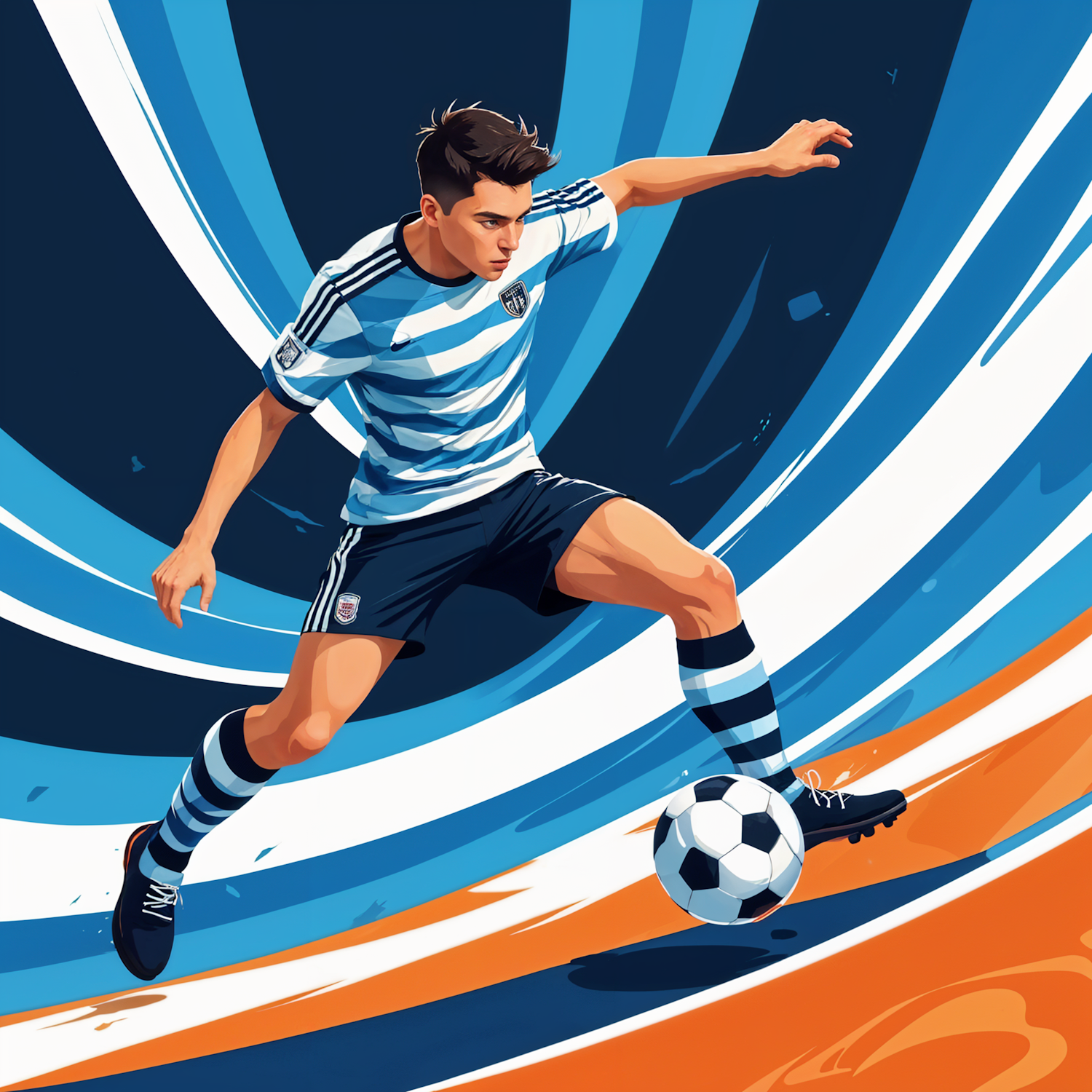 Dynamic illustration of a soccer player in action with a blue and white jersey, set against an abstract swirl background.