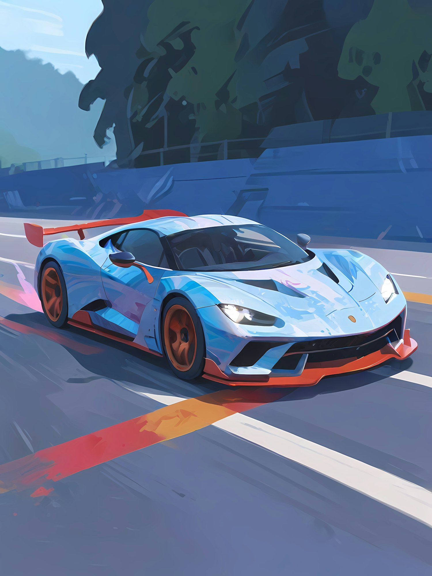 Dynamic illustration of a light blue sports car with orange accents speeding on a racetrack, showcasing sleek design and motion.