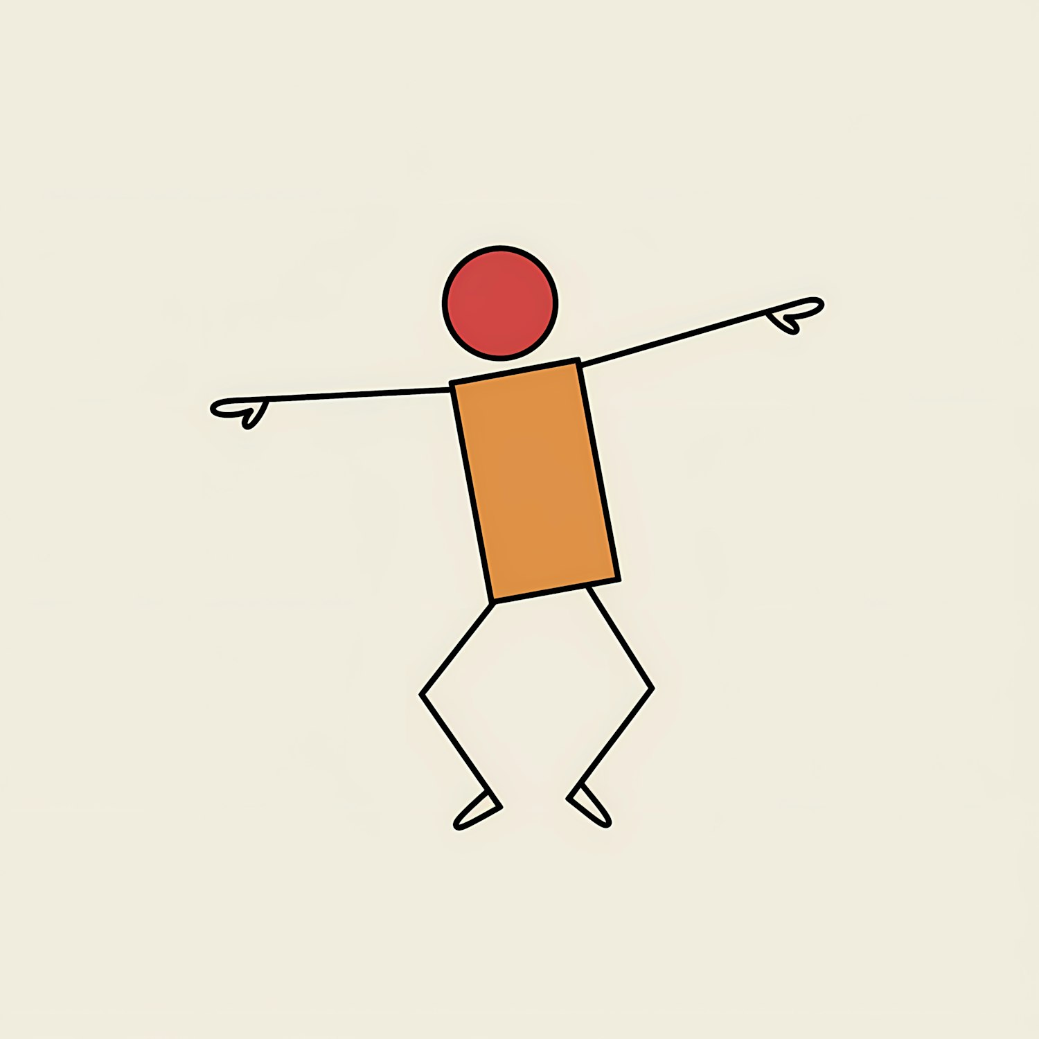 Minimalist stick figure illustration with a red head, orange torso, and dynamic pose on a beige background.