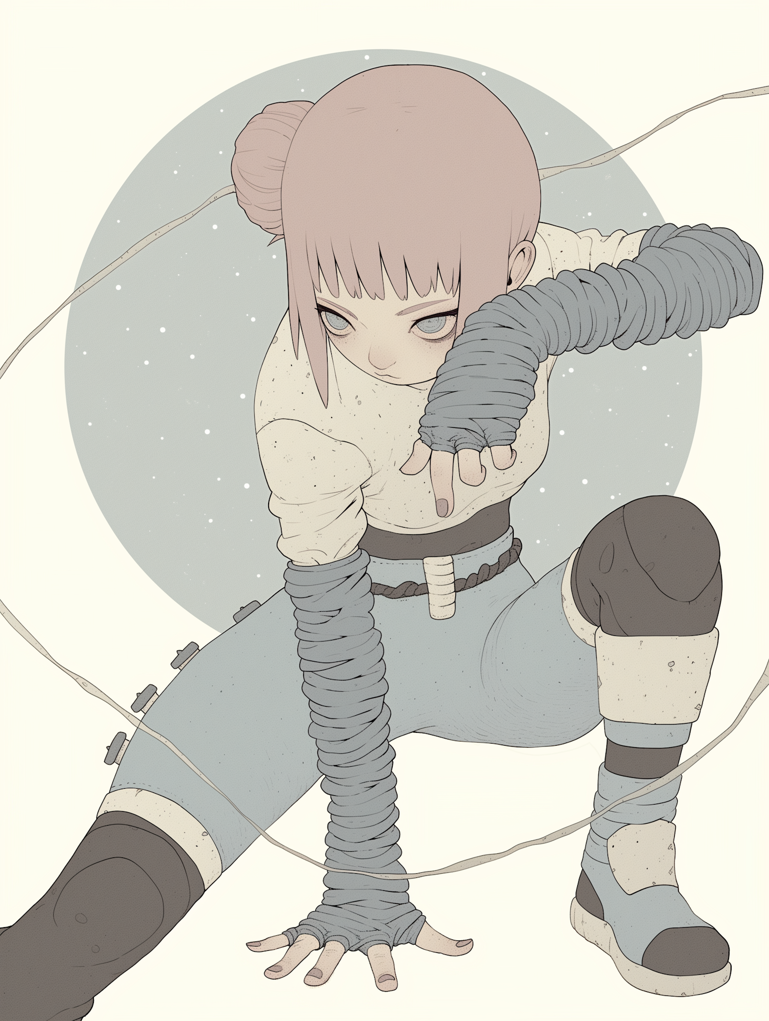 Dynamic illustration of a character with pink hair and blue outfit, crouching with intense focus. Soft pastel colors and starry background.
