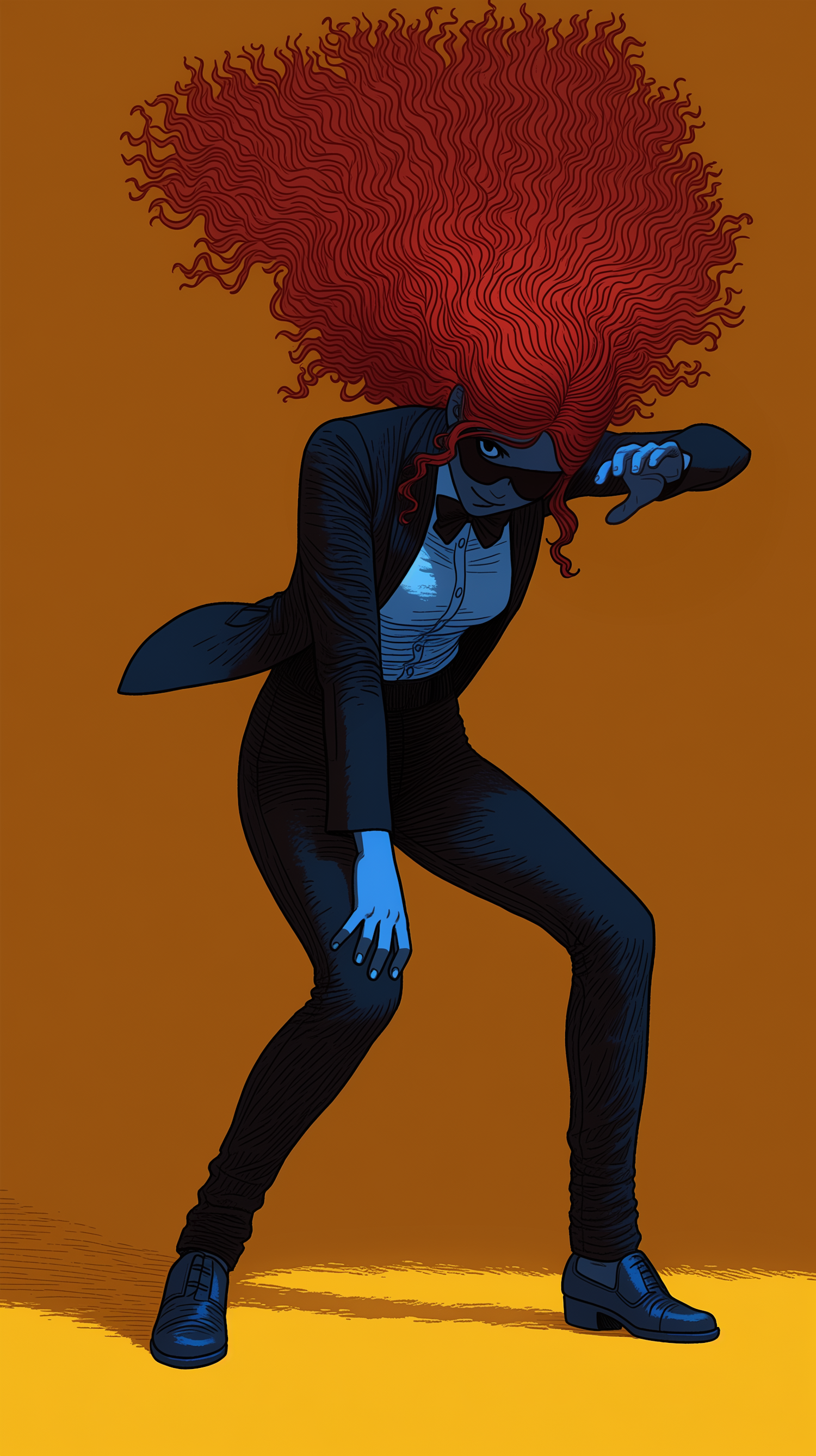 Stylized illustration of a dynamic figure with red hair, blue skin, and a black suit, set against a vibrant orange background.