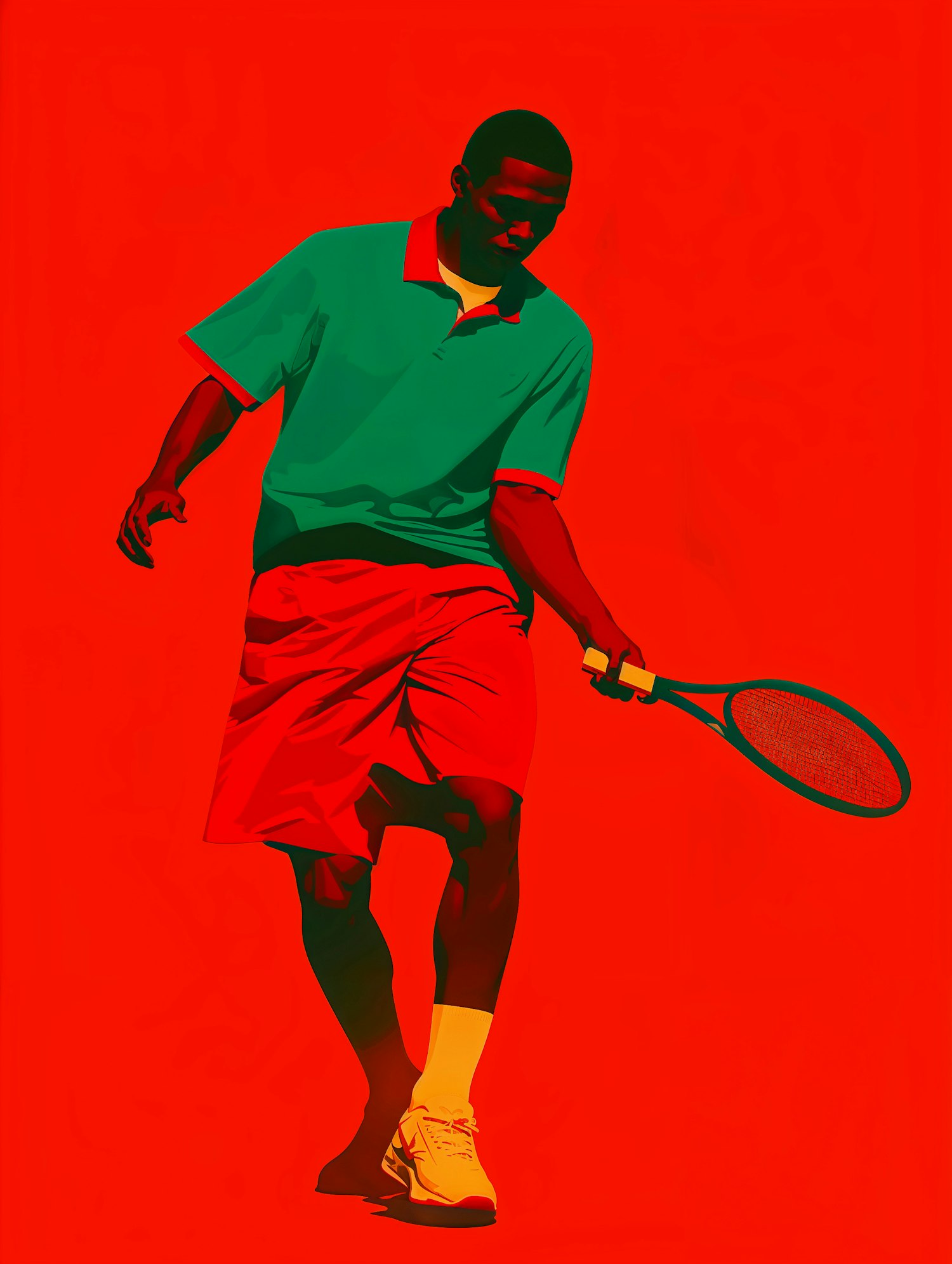 Stylized illustration of a tennis player in vibrant colors, featuring a dynamic pose and bold contrasts against a red background.