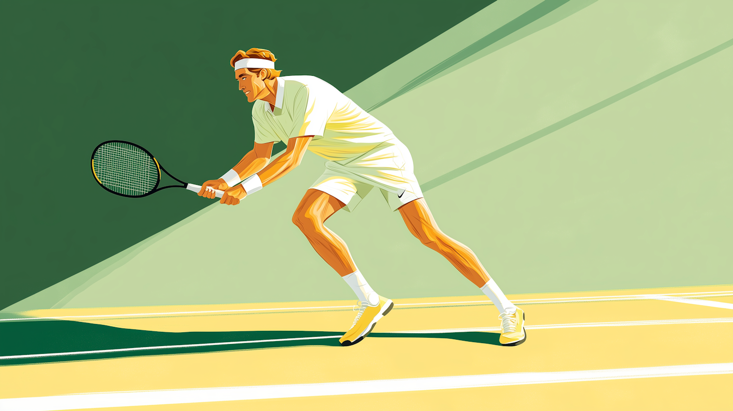 Dynamic illustration of a tennis player in action, wearing white attire on a green and yellow court. Bold colors and sharp lines enhance movement.