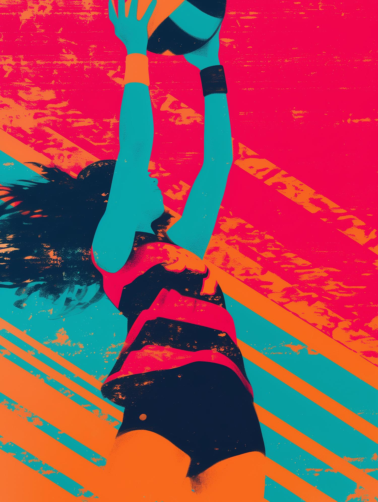 Dynamic illustration of a volleyball player mid-jump, rendered in bold orange, teal, and pink tones with abstract, energetic background.