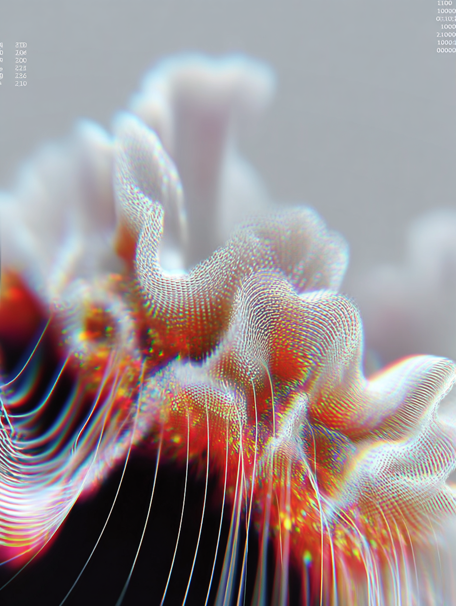 Abstract digital art with vibrant colors and intricate textures, featuring dynamic wave-like structures and a futuristic aesthetic.