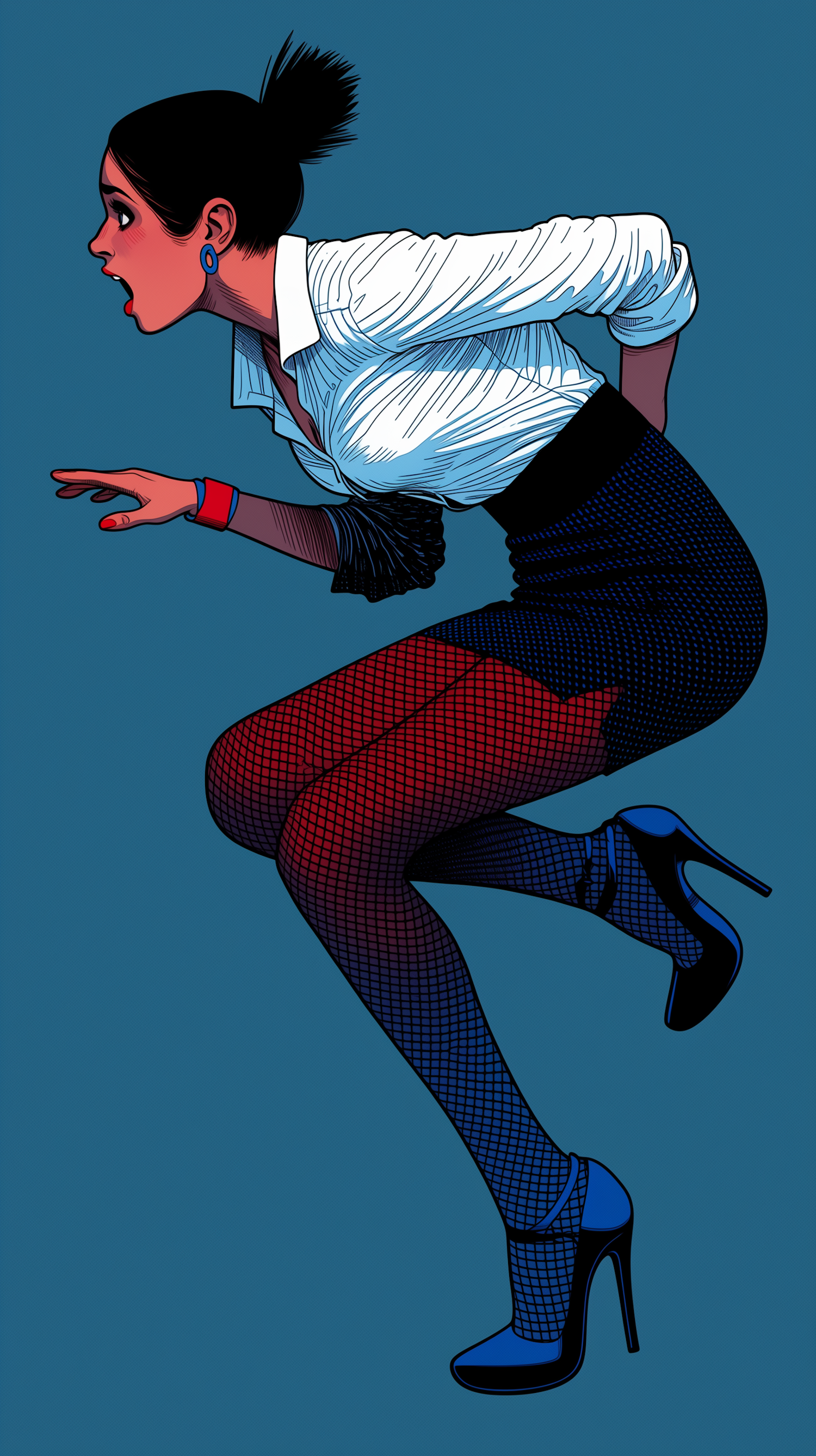 Stylized illustration of a woman in a dynamic pose, wearing a white blouse, black skirt, and fishnet stockings, set against a blue background.
