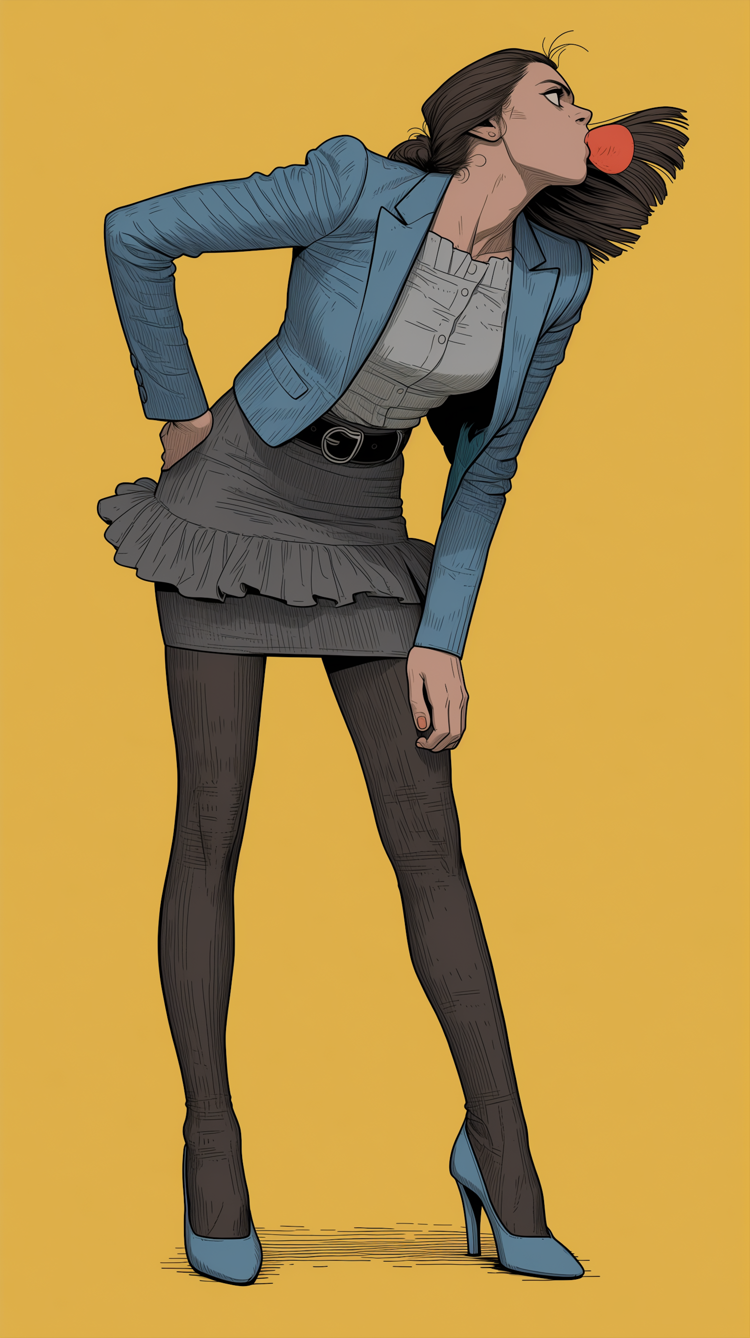 Stylized illustration of a woman in a blue blazer and gray skirt, dynamically posed against a yellow background.