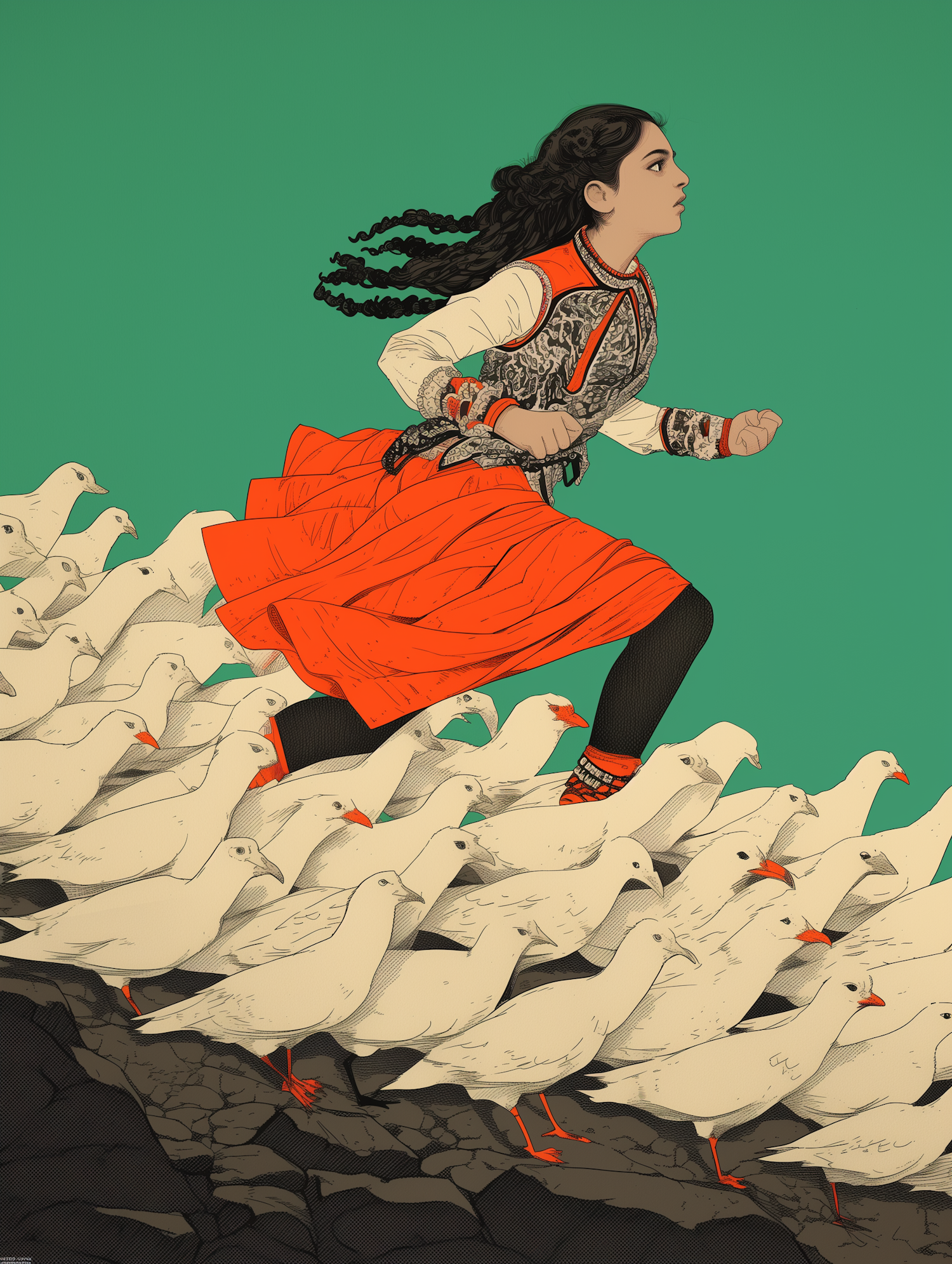 Dynamic illustration of a woman in traditional attire running with white doves, set against a bold green background.
