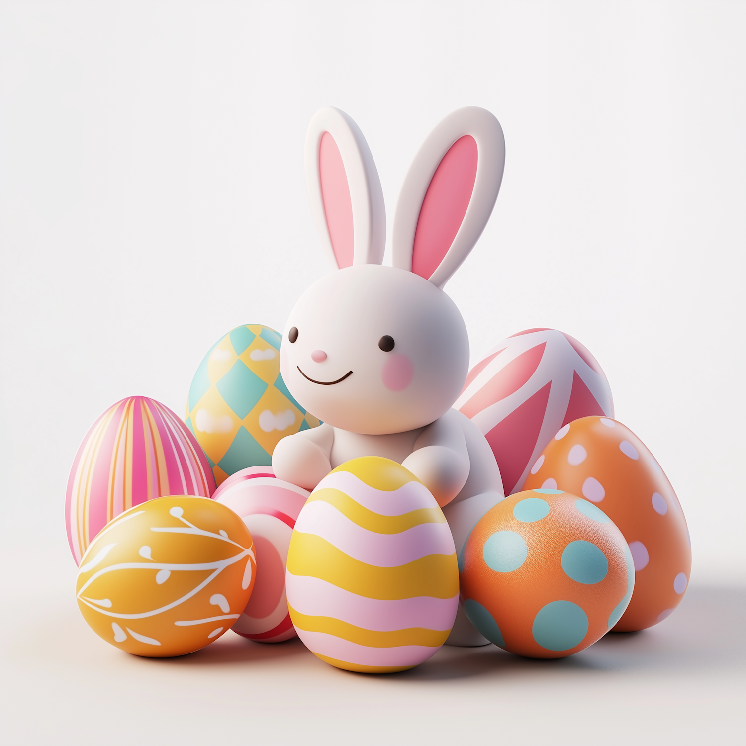 Adorable 3D bunny surrounded by colorful Easter eggs with vibrant patterns, perfect for celebrating the festive season.