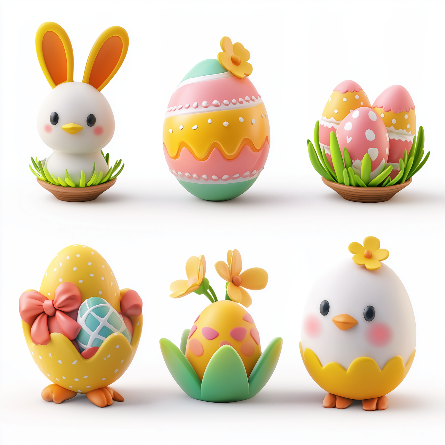 Adorable Easter-themed illustration with bunnies, chicks, and colorful eggs in pastel hues, perfect for springtime celebrations.