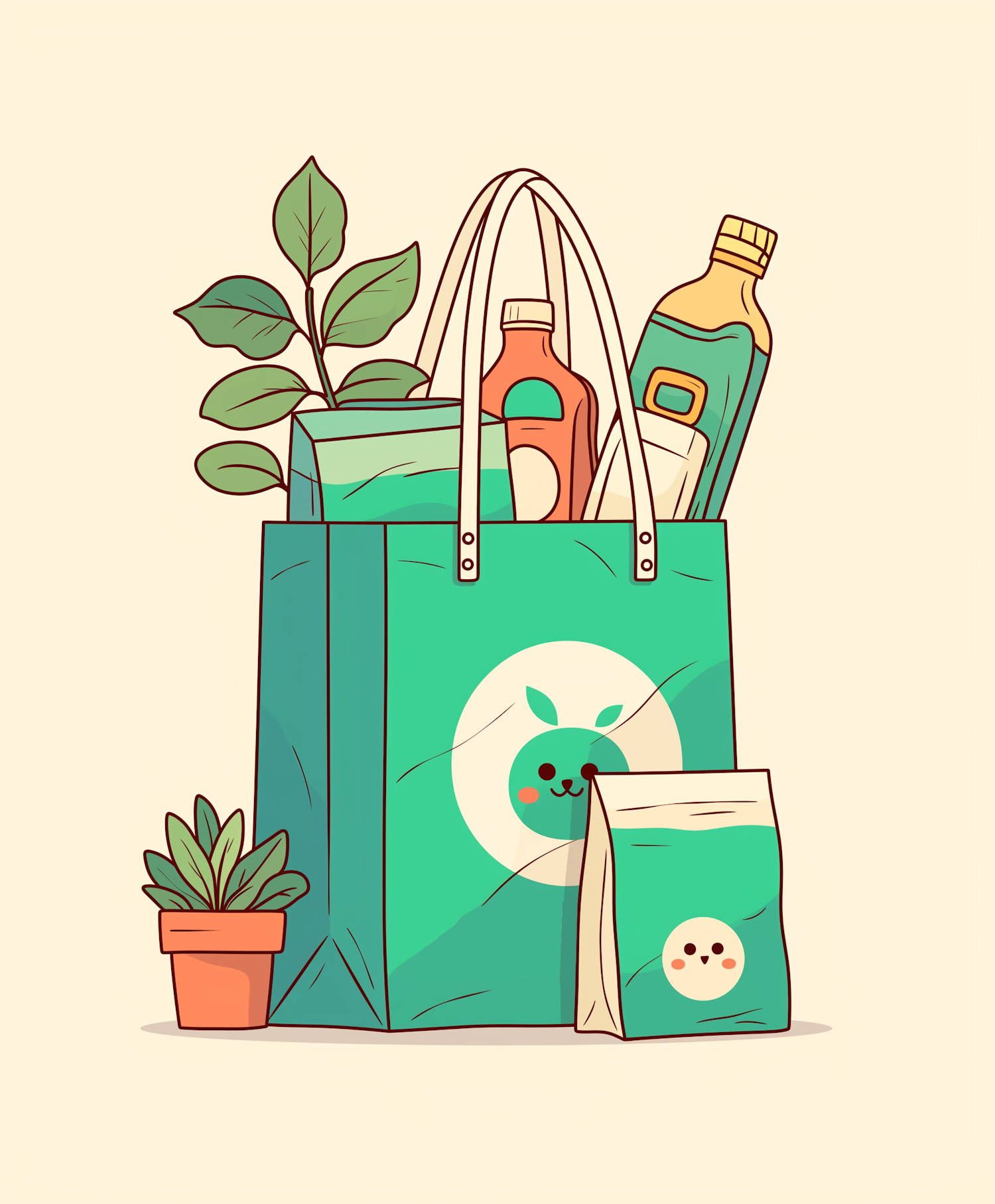 Illustration of a green shopping bag with bottles and plants, featuring a cute smiling face design on a beige background.