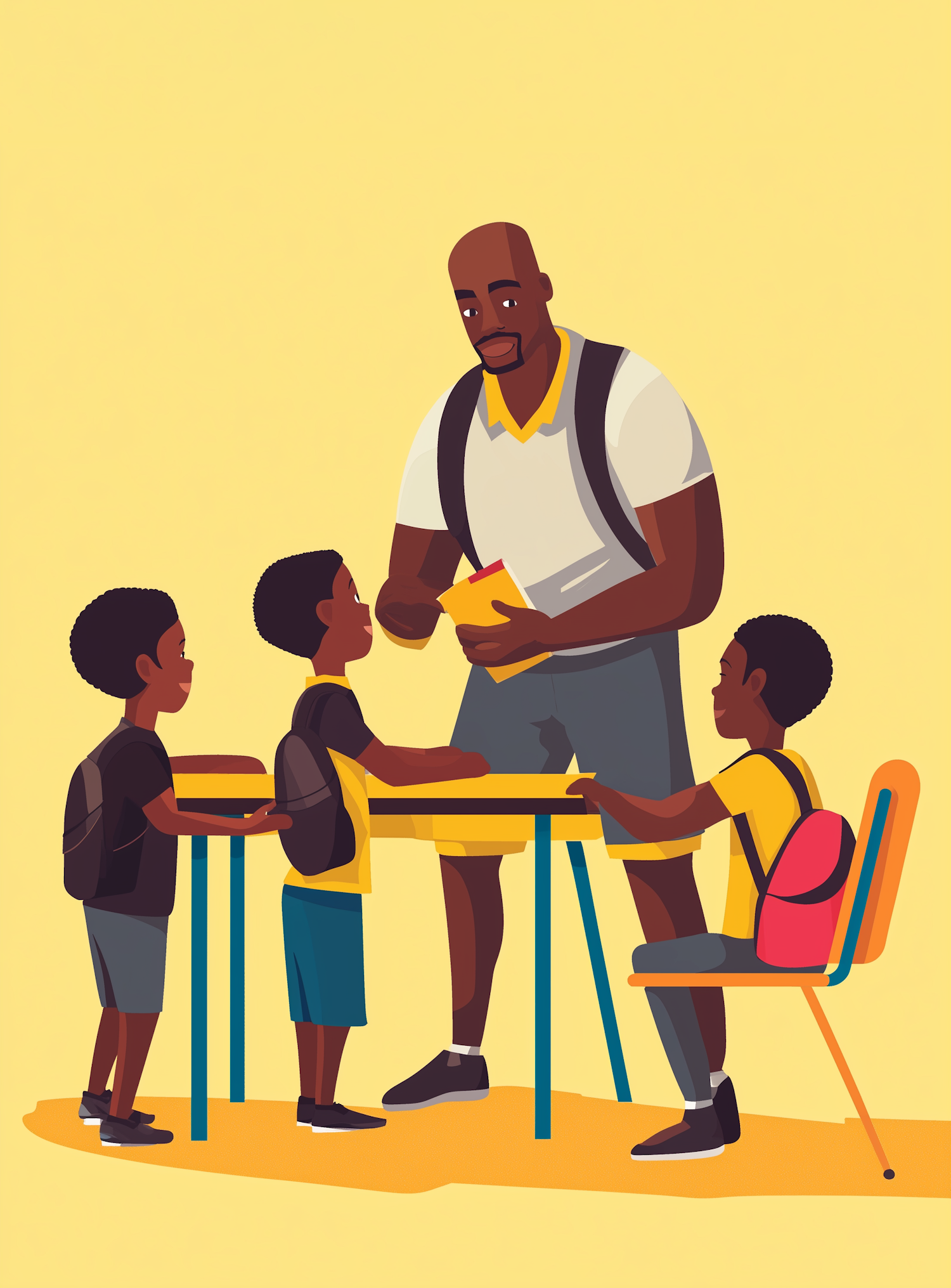 Illustration of a teacher engaging with three young students in a classroom setting, fostering learning and interaction.