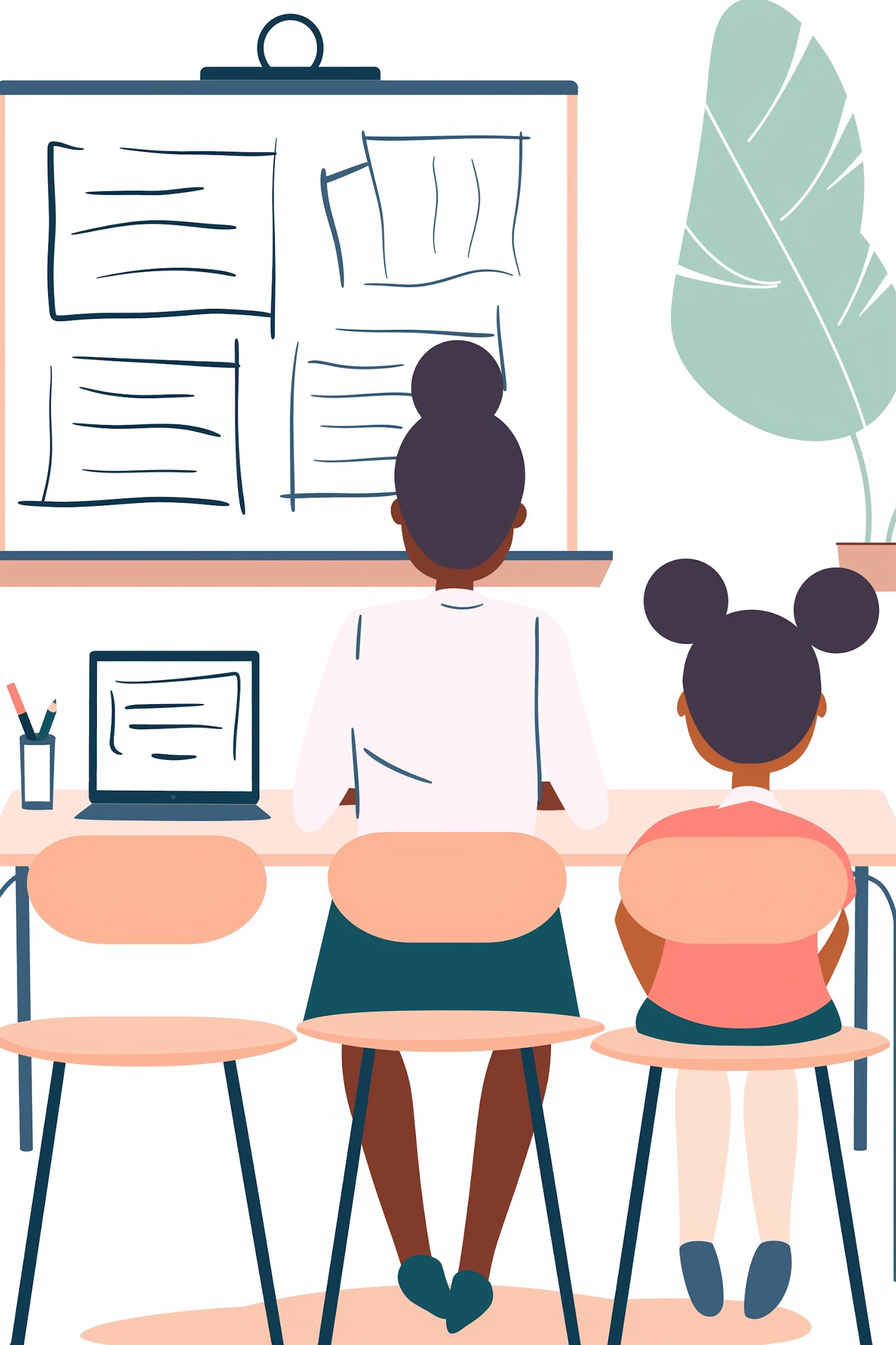 Illustration of a teacher and student in a classroom, facing a whiteboard with abstract writing. Minimalist design with a laptop and plant.