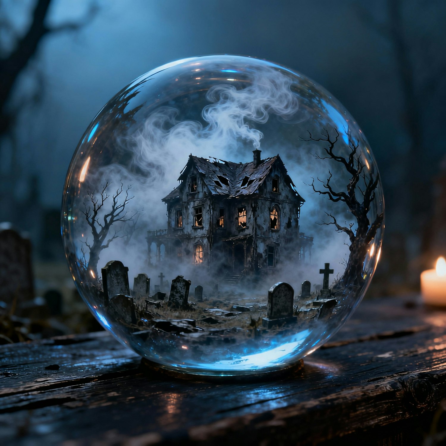 A spooky glass sphere encases a haunted house and graveyard, surrounded by mist and eerie lighting, perfect for Halloween vibes.