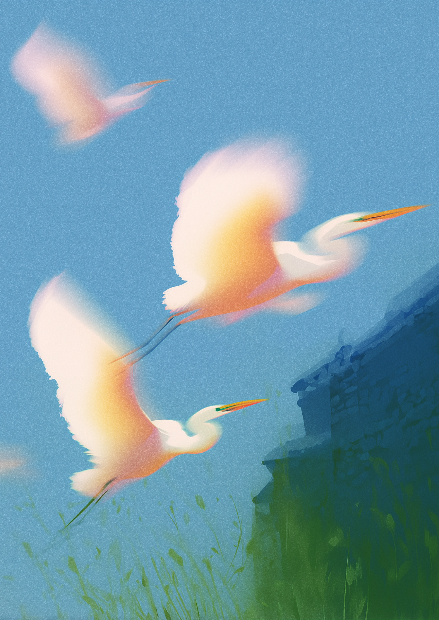 Graceful white birds in flight with glowing feathers against a blue sky, complemented by greenery and a rustic stone structure.