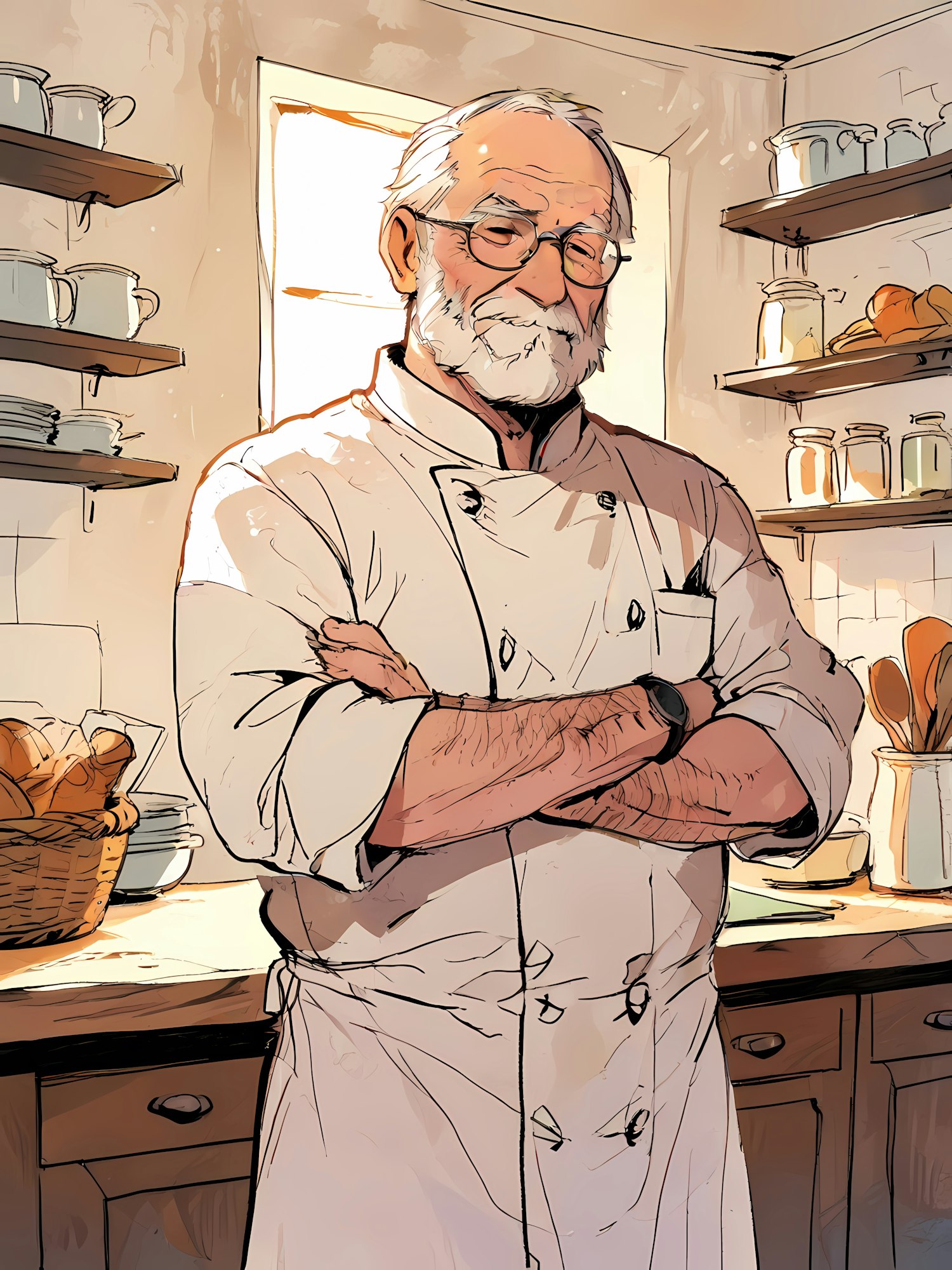 Elderly chef with white beard in a cozy kitchen, wearing a white coat, surrounded by shelves of cups and bread basket.