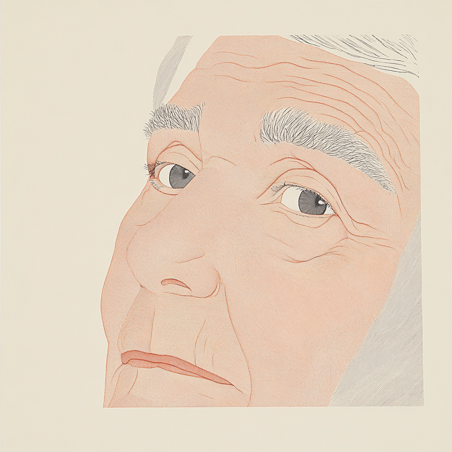 Minimalist illustration of an elderly face with white hair, light eyes, and soft wrinkles, showcasing a calm and introspective expression.