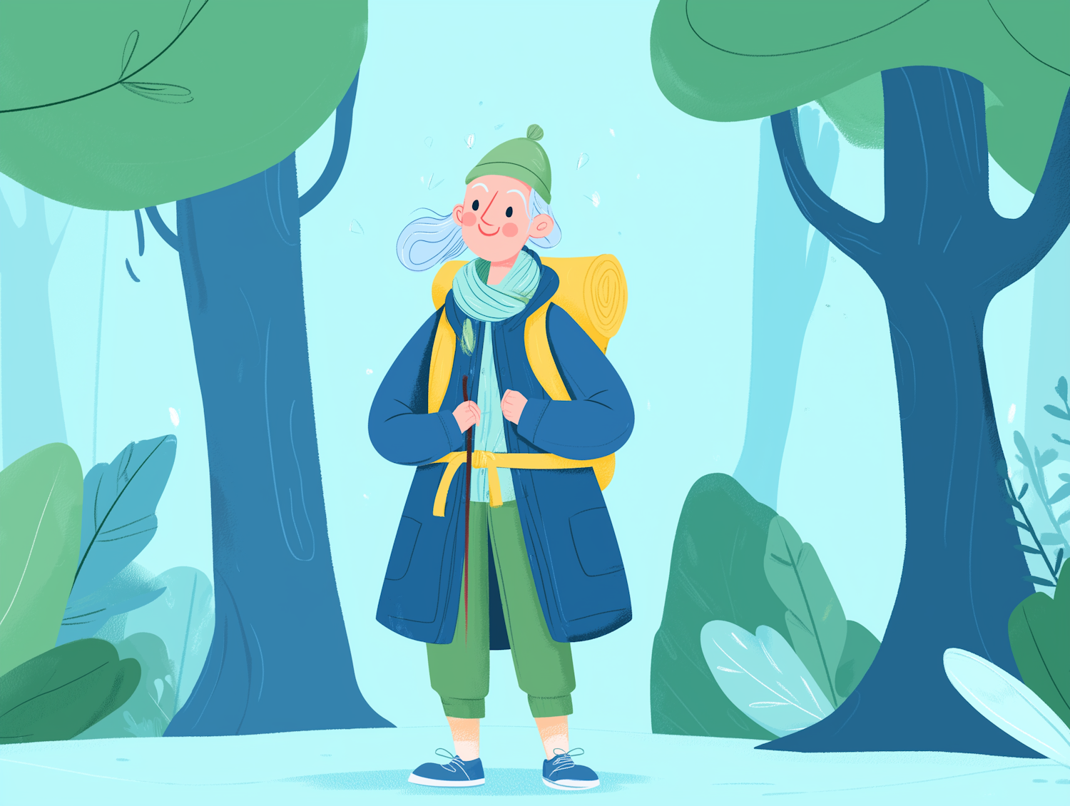 A cheerful hiking-themed illustration showing a warmly dressed character enjoying a lush green forest setting.