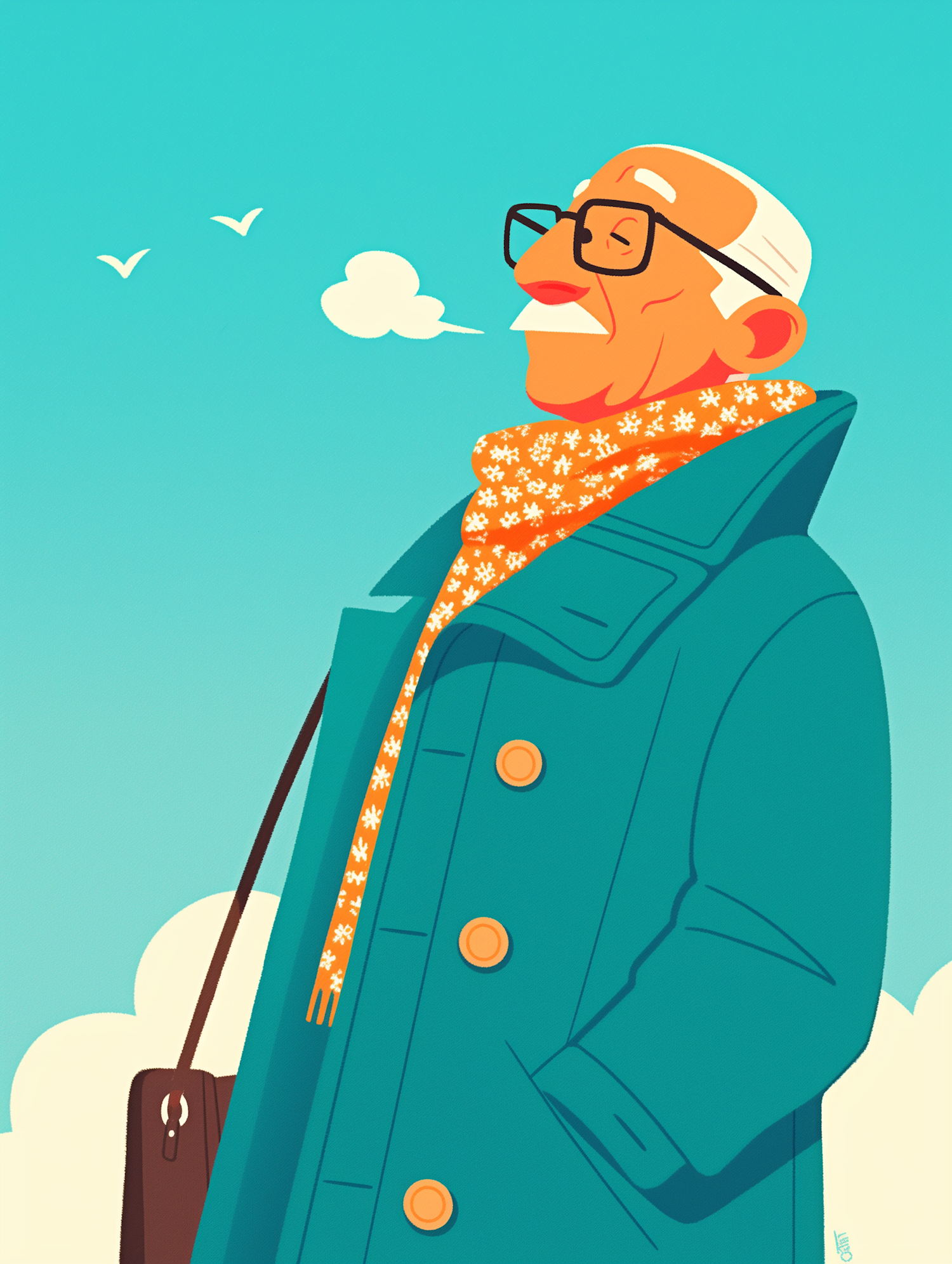Illustration of a cheerful elderly man in a teal coat and orange scarf, enjoying a crisp day under a bright blue sky.