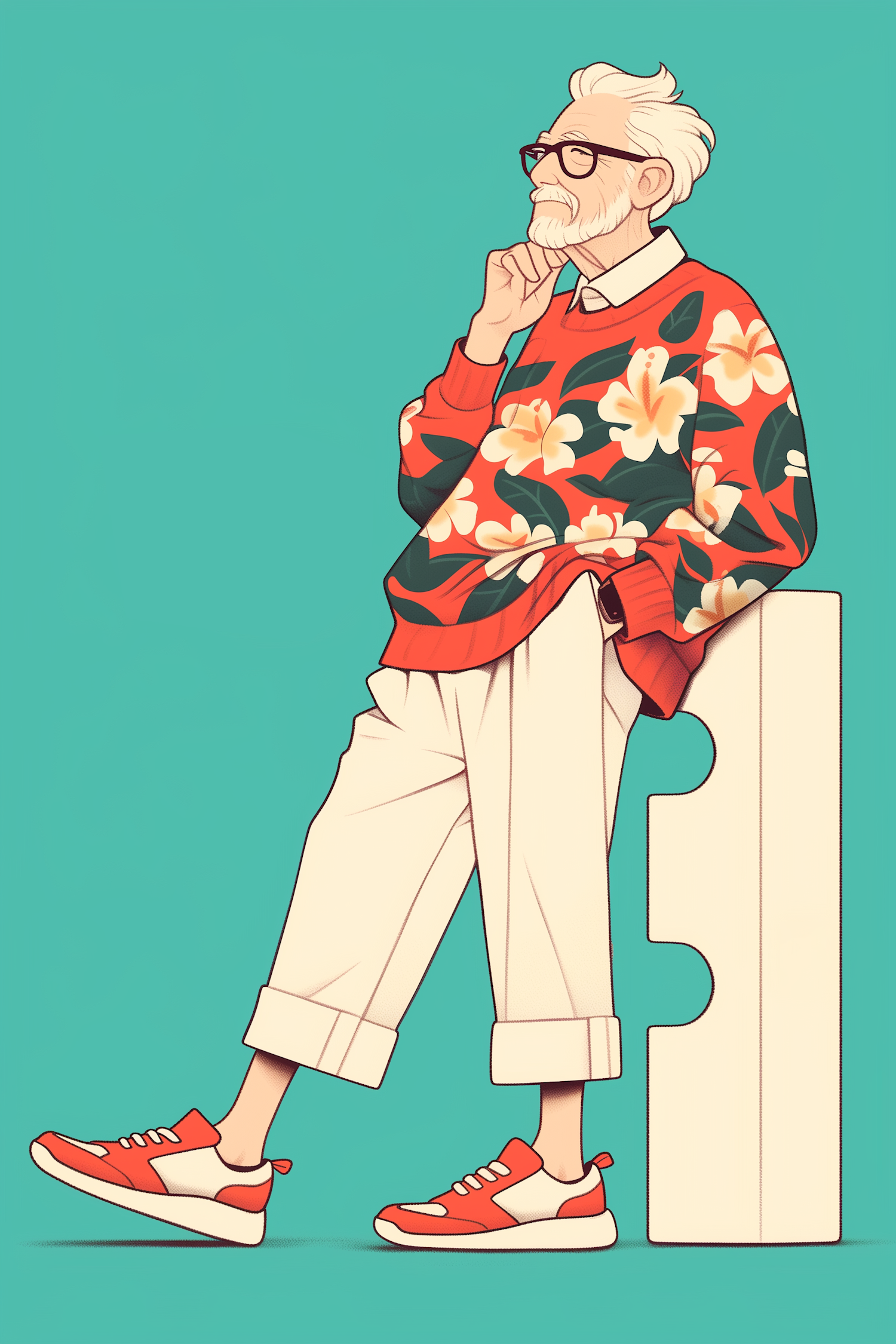 Stylish elderly man in floral sweater and red sneakers, leaning thoughtfully against a block on a teal background.