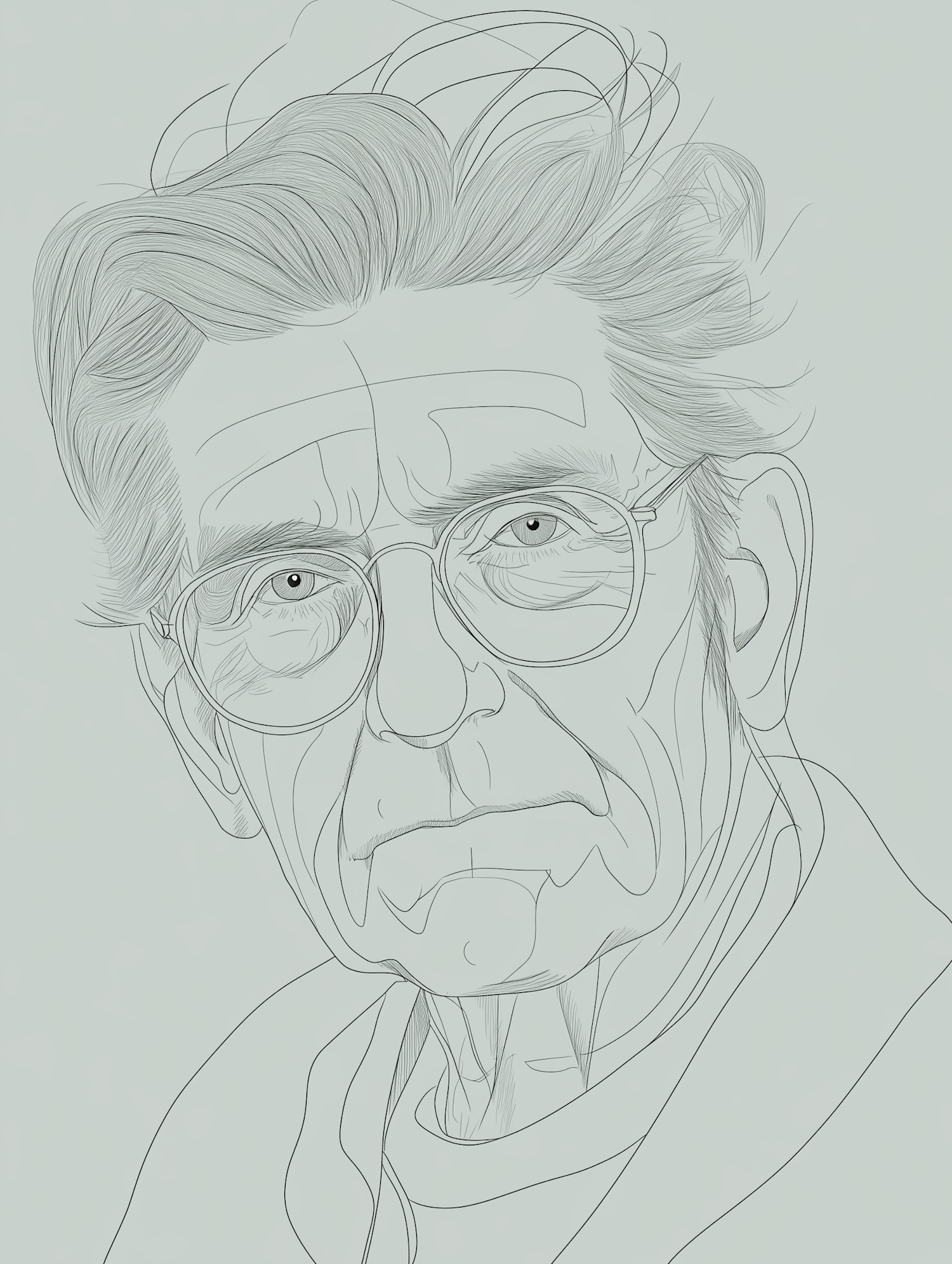 Intricate line drawing of an elderly man with glasses, showcasing detailed facial features and a contemplative expression.