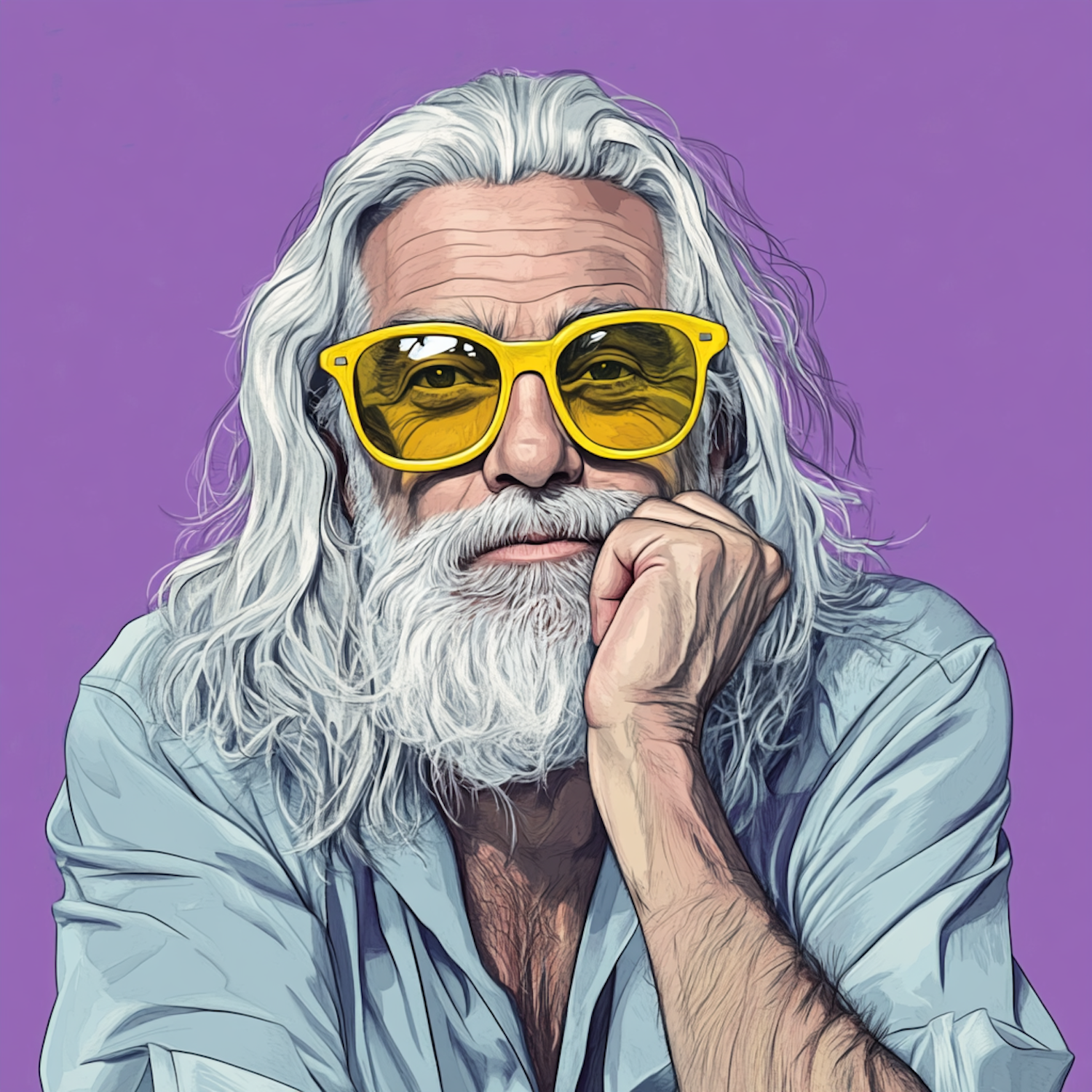Stylish older man with white hair and beard, wearing yellow sunglasses and a blue shirt, set against a vibrant purple background.