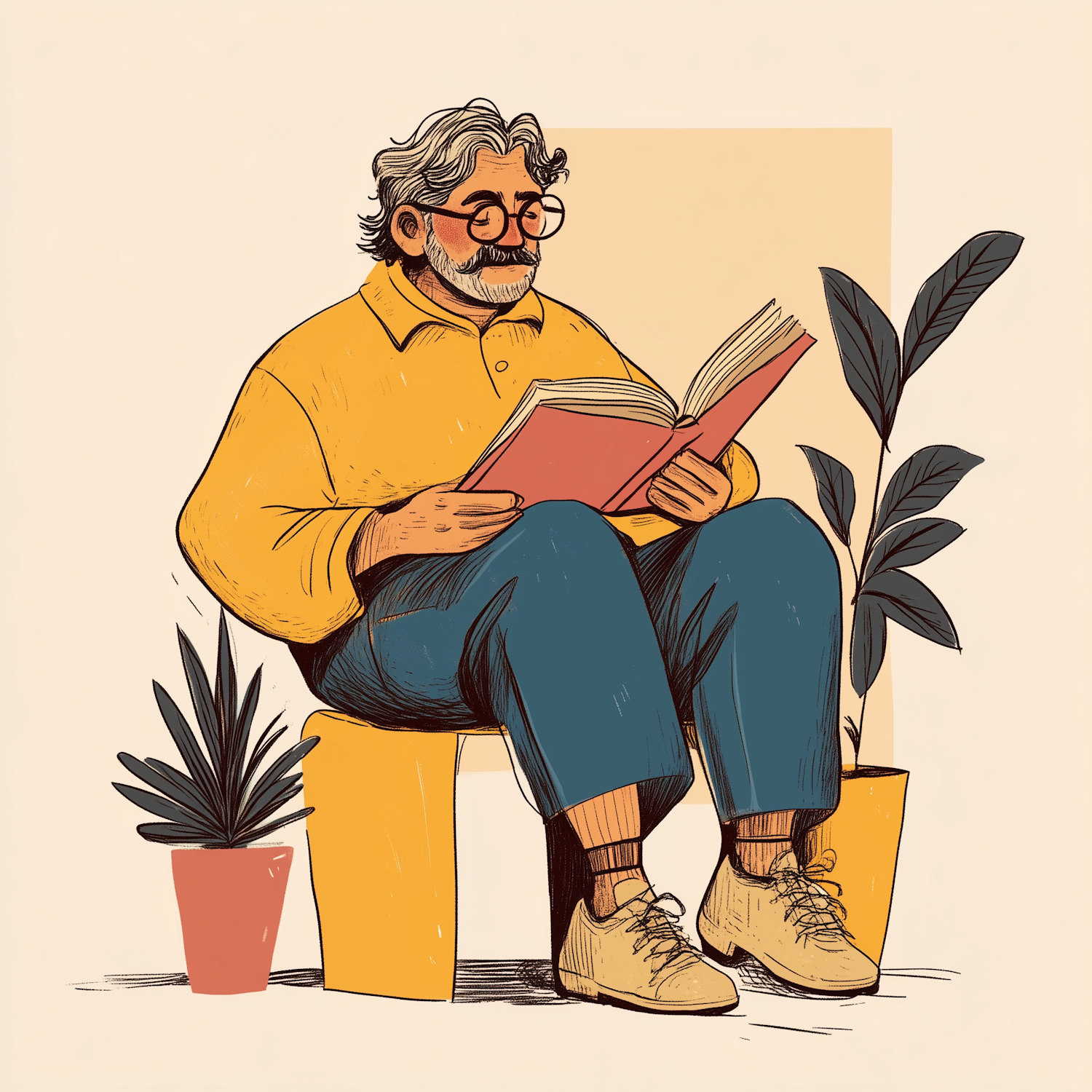 Illustration of an elderly man reading a book, surrounded by potted plants, wearing a yellow shirt and blue pants.
