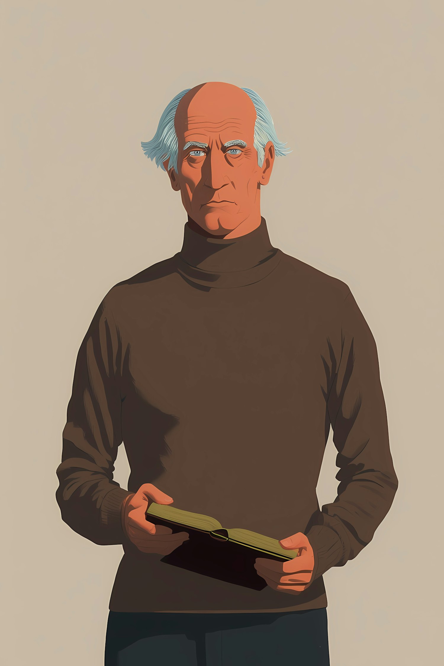 Stylized illustration of an elderly man in a brown turtleneck holding a book, set against a plain beige background.