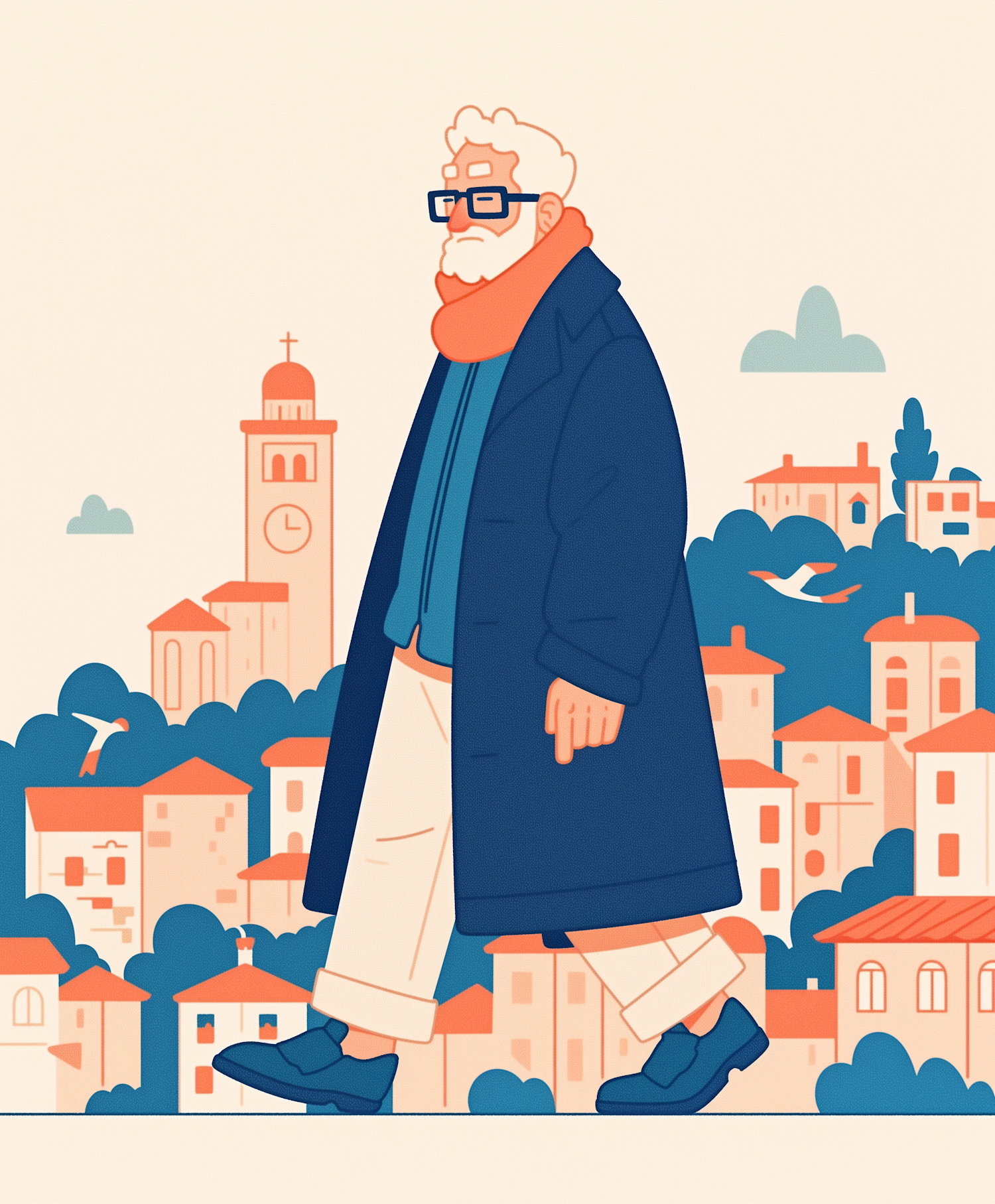 Stylized illustration of an elderly man walking in a quaint town with colorful houses and a church tower.