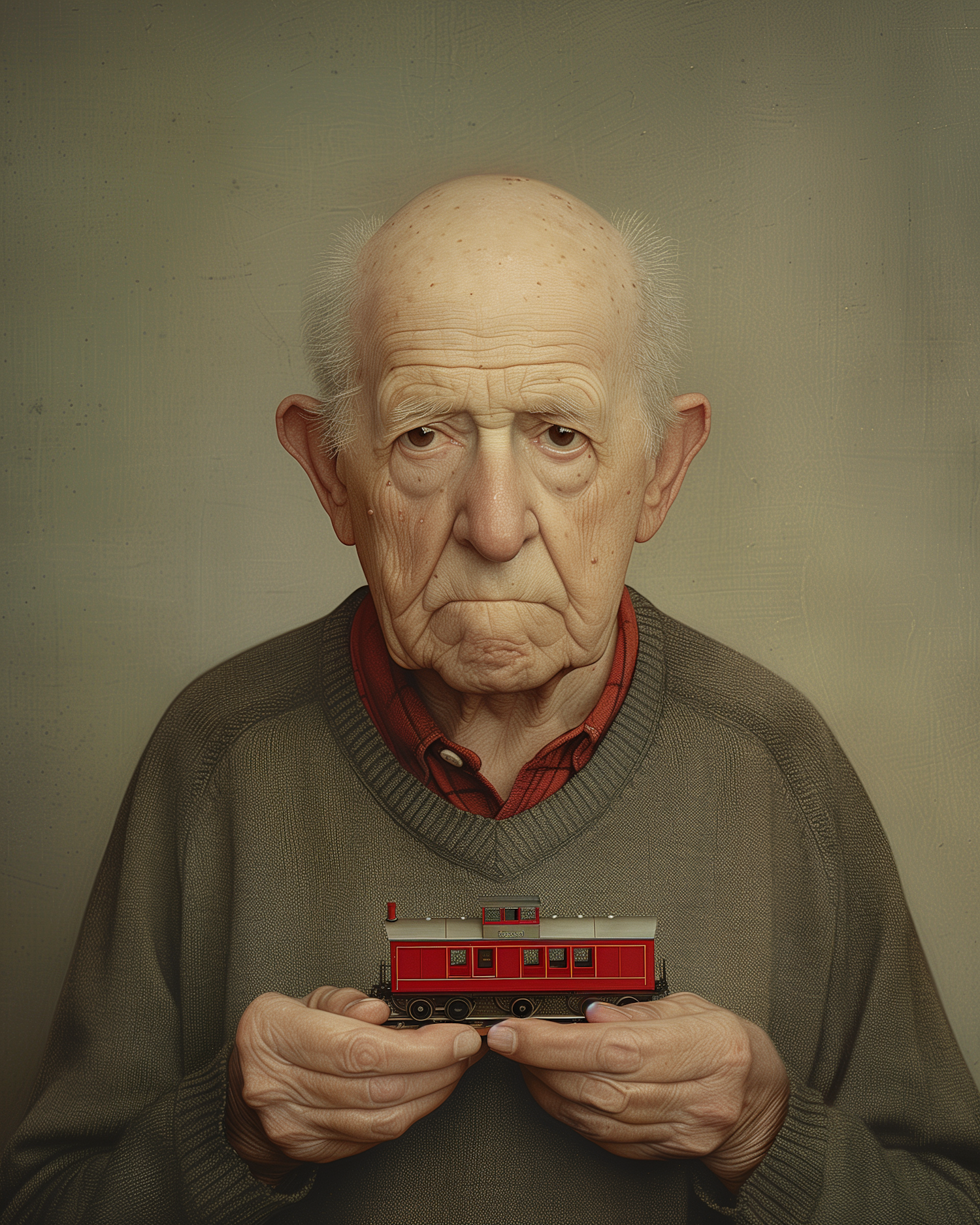 Elderly man with a solemn expression holds a detailed red train model, evoking nostalgia and reflection. Muted background enhances the mood.