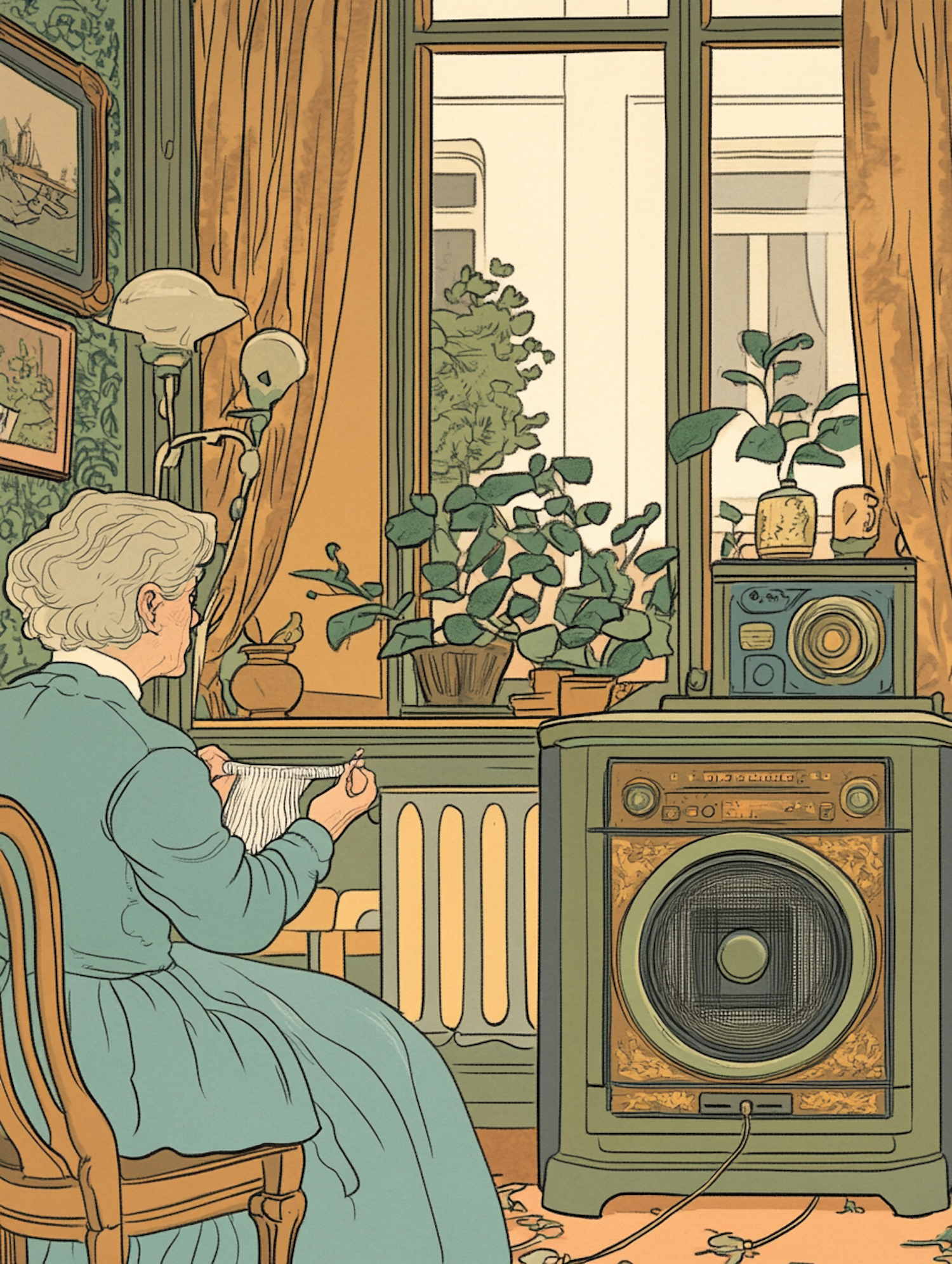 Elderly woman knitting in a cozy room with vintage decor, potted plants, and a classic radio. Soft, muted colors create a nostalgic vibe.