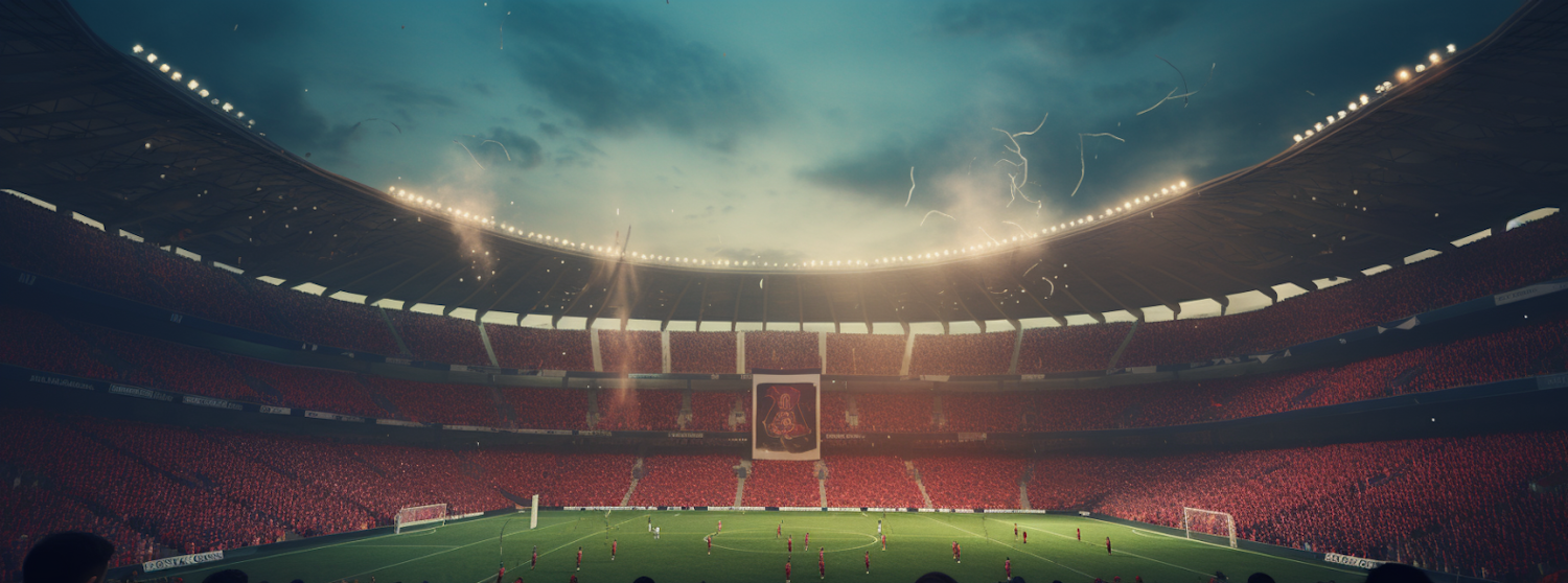 A vibrant football stadium packed with fans, players on the field, and dramatic lighting creating an electrifying atmosphere.