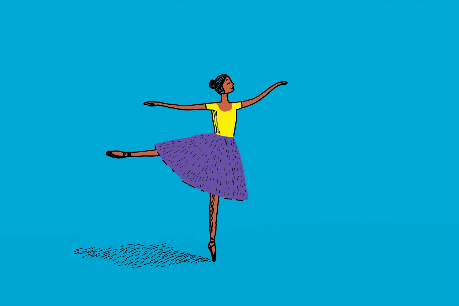 Illustration of a ballerina in a yellow top and purple skirt performing a graceful pose on a blue background.