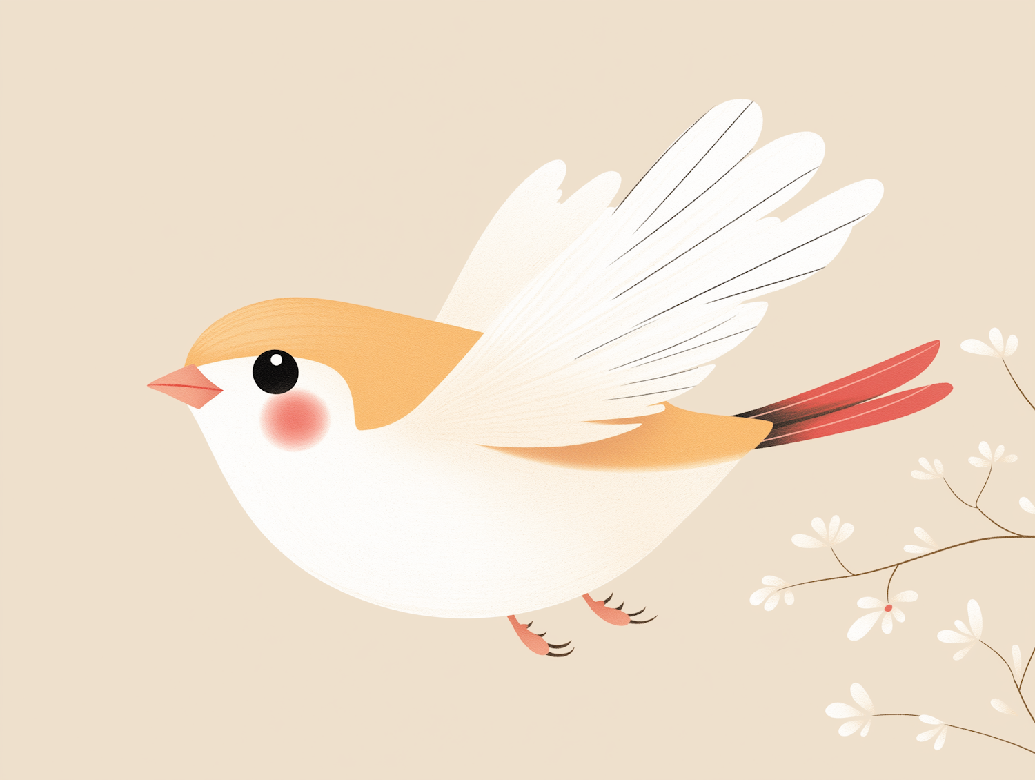 A charming illustration of a bird in mid-flight with a soft color palette and a delicate floral background.