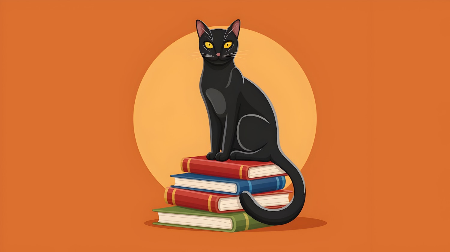 A sleek black cat with yellow eyes sits on colorful books against a warm orange background, creating a cozy and whimsical vibe.