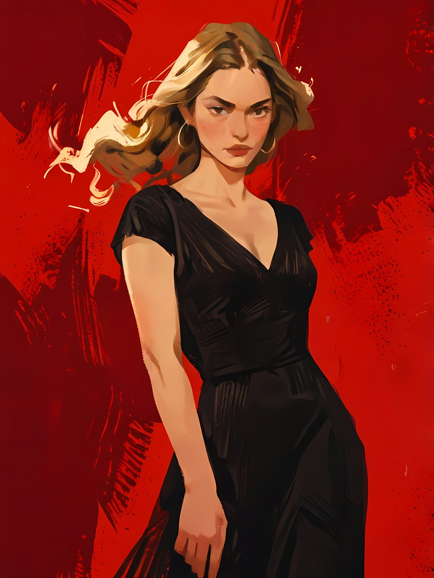 Striking illustration of a blonde woman in black against a vivid red backdrop, painted with dynamic and expressive abstract strokes.