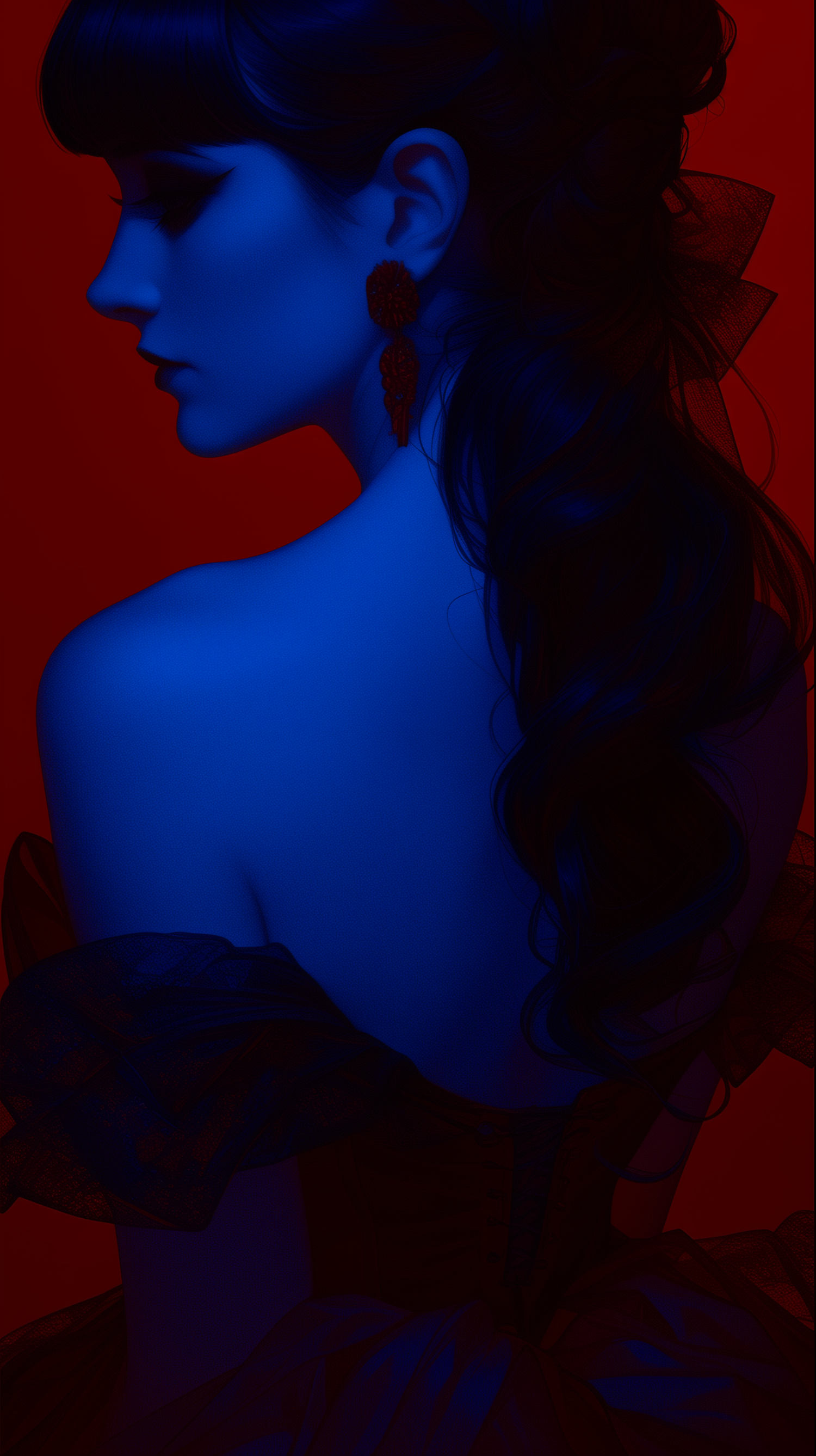 A dramatic portrait of a woman in profile, illuminated in blue light against a red background, showcasing elegant details and striking contrast.
