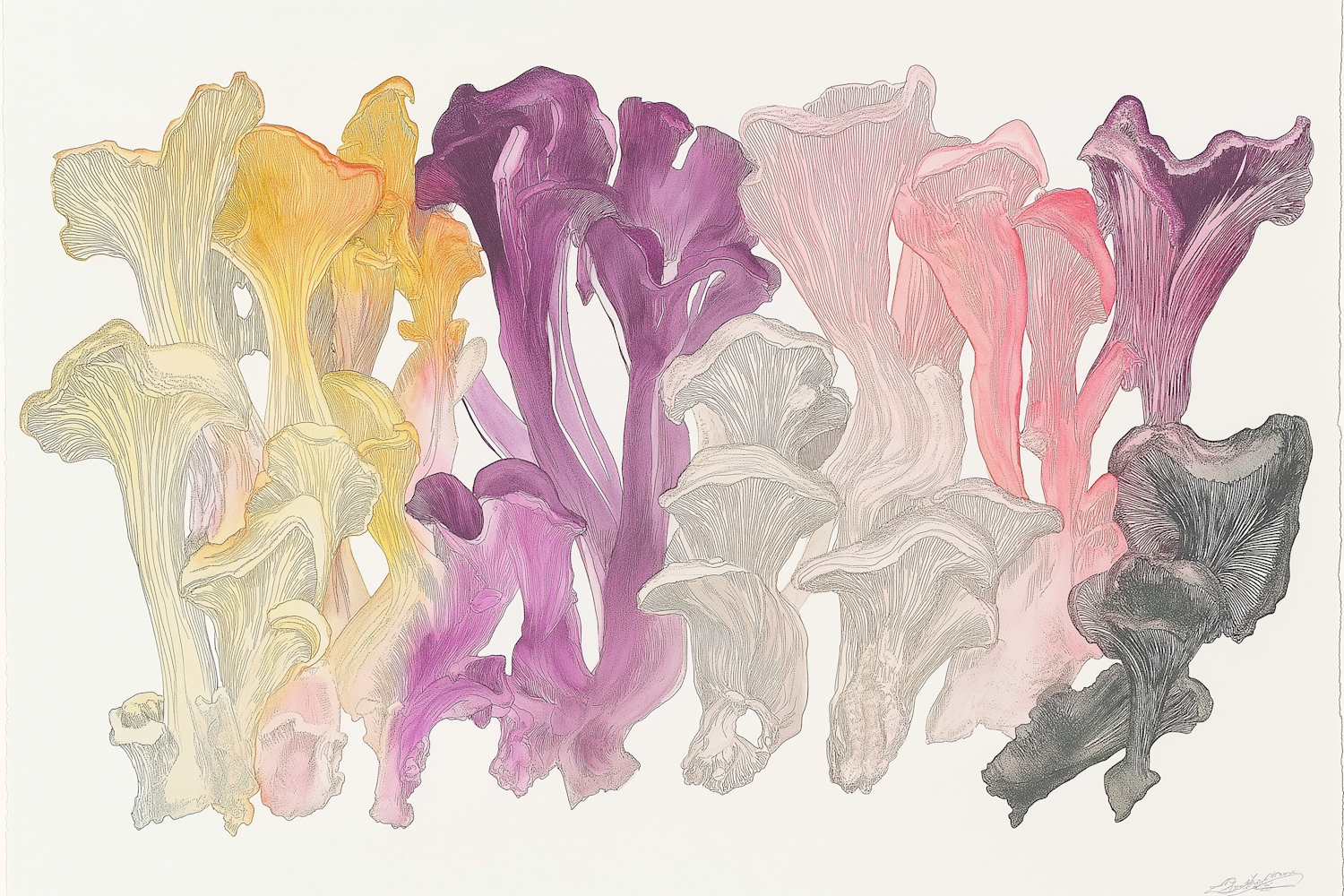 Colorful mushroom illustration with intricate details and vibrant hues of yellow, purple, pink, and gray on a white background.