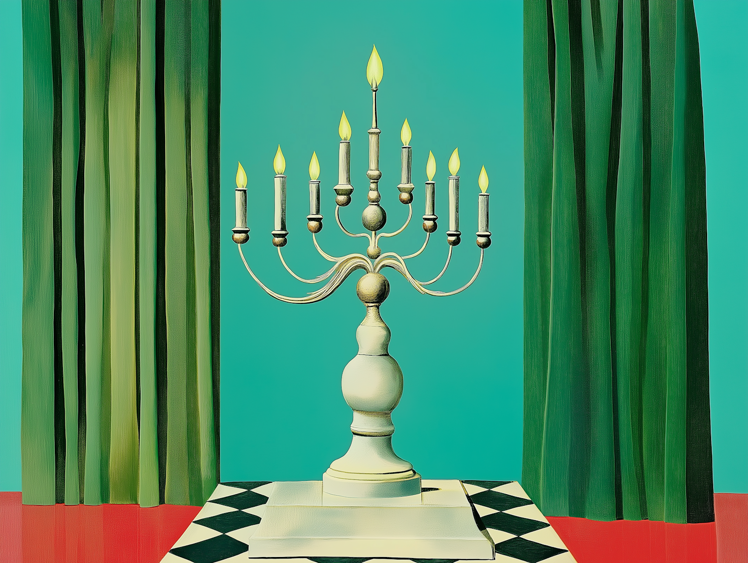 Stylized menorah with lit candles on a checkered platform, framed by green curtains and a vibrant red floor.
