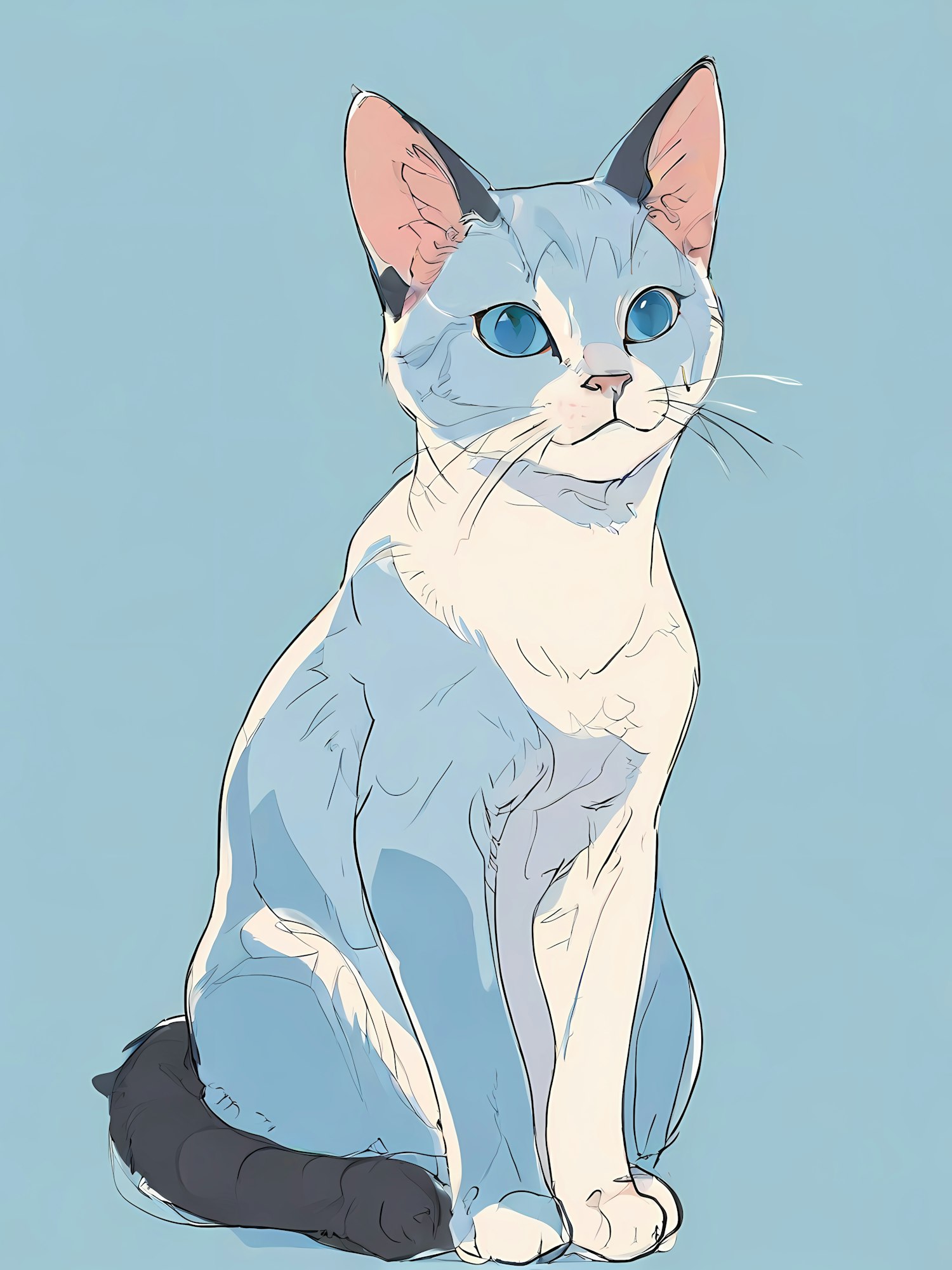 Minimalist illustration of a white and gray cat with blue eyes, black-tipped tail, and black ear markings on a light blue background.