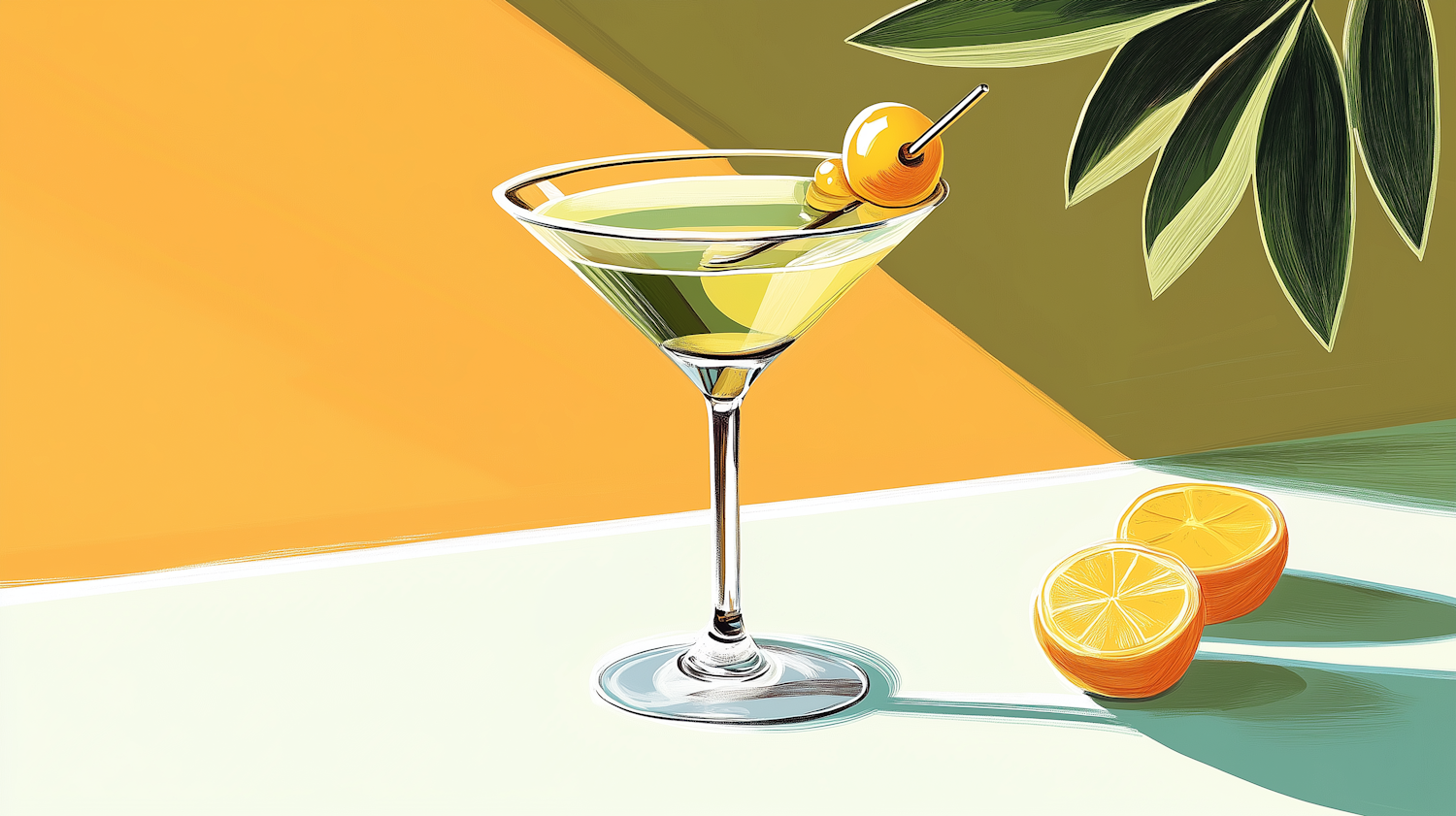 Illustration of a martini glass with cherries, orange halves, and tropical leaves in a vibrant, modern style.