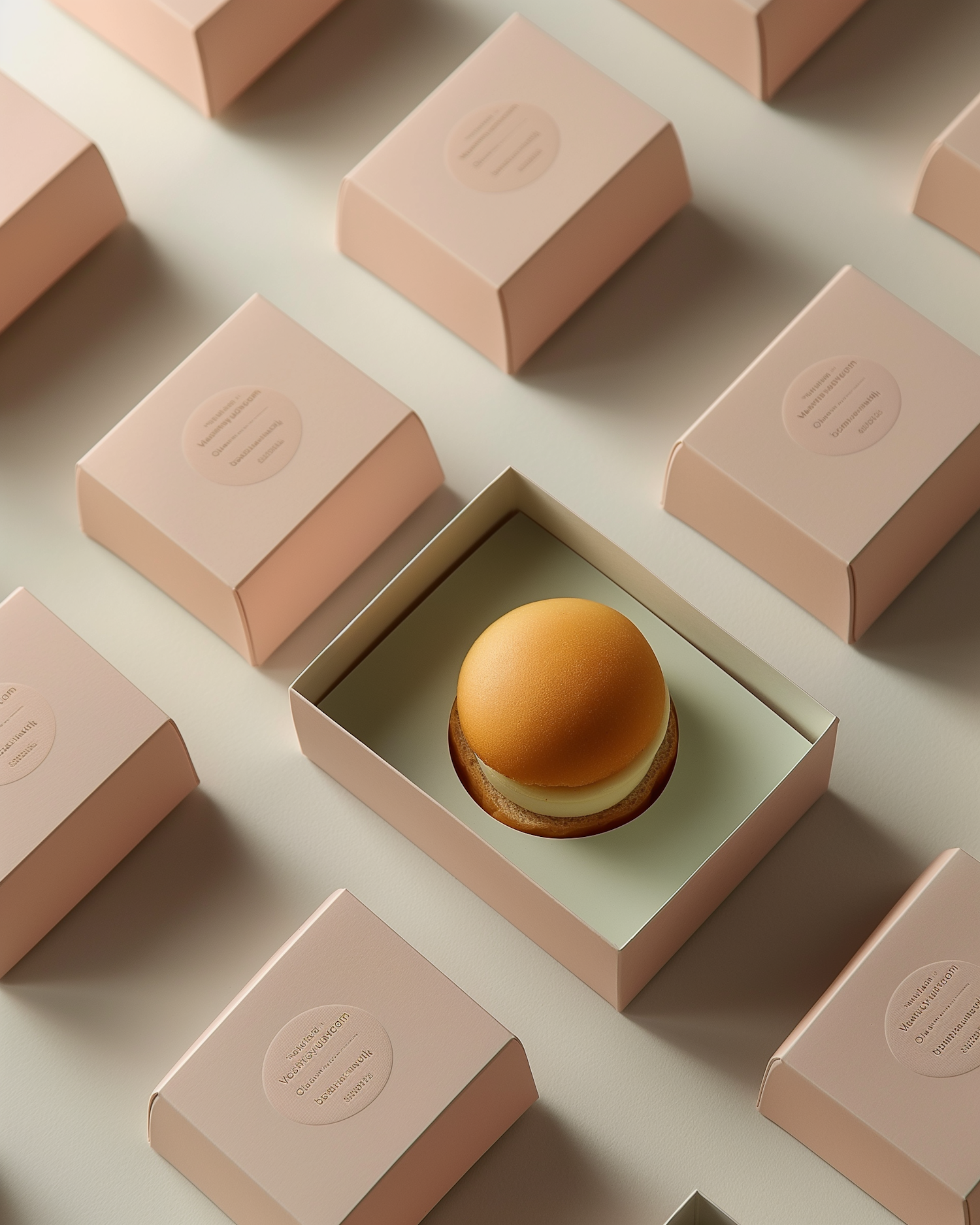 Elegant pastel pink boxes with a golden pastry inside one, creating a minimalist and sophisticated visual pattern.